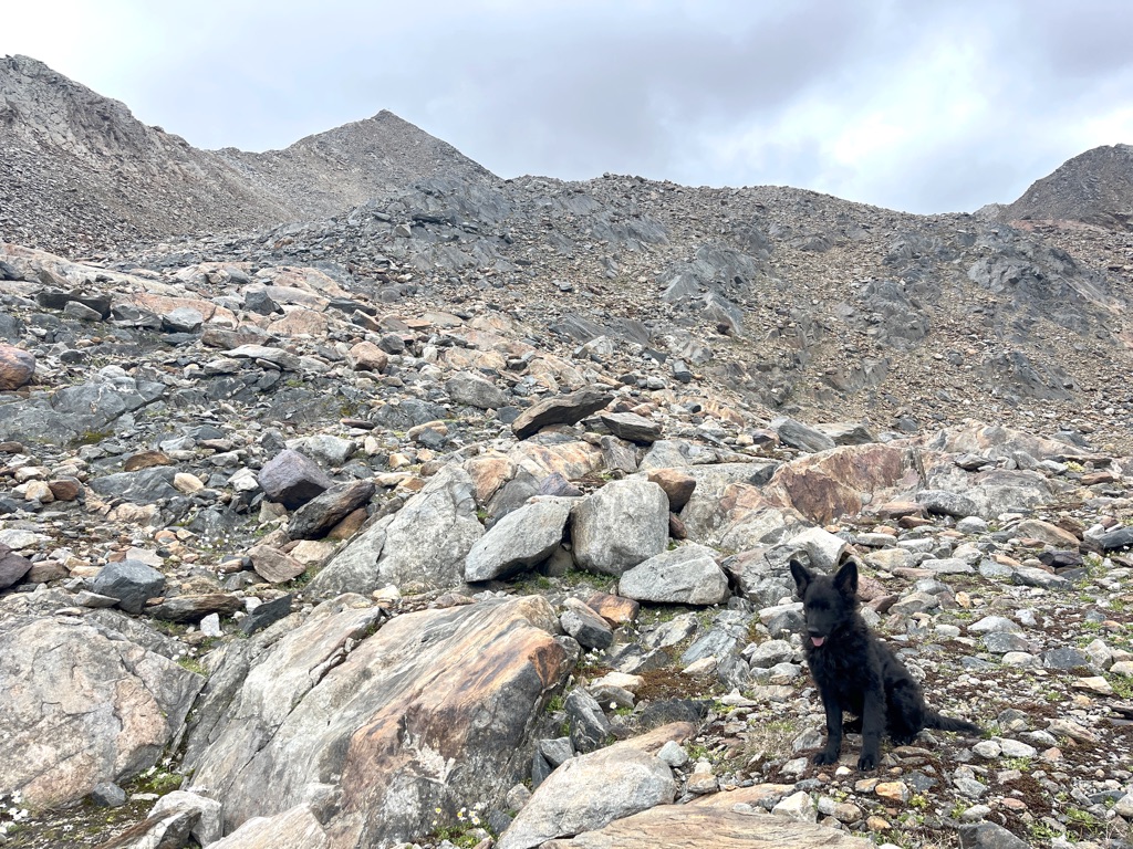 Für mich persönlich ist – bei aller Unscheinbarkeit des Gipfels – der Aufstieg auf den Scheiblehnkogel etwas Besonderes. Es ist nämlich der allererste Dreitausender den Nachwuchs-Wanderhund Greta bestiegen hat. Die kleine Maus ist gerade mal ein halbes Jahr alt gewesen und ich habe sie immer mal wieder im Rucksack getragen, um ihre Gelenke zu schonen. Aber es ist eben auch wichtig für sie als angehender Berghund, schon möglichst frühzeitig im Leben Kontakt mit Bergen zu haben.