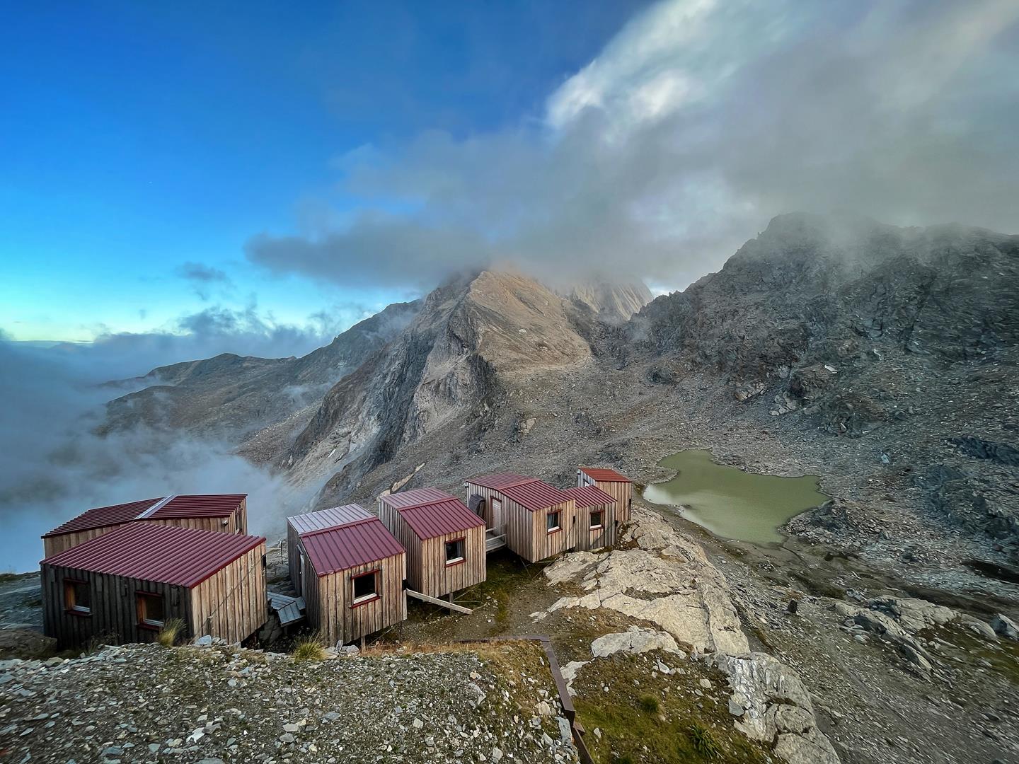 Irgendwann taucht in Richtung Himmel das Rauhjoch-Biwak (2) auf, das mit seiner silbernen, achteckigen Form auf Stelzen etwas an Raumschiff Enterprise erinnert. Bis wir es aber erreichen, sind noch einige Höhenmeter zu gehen – die sich durchaus etwas ziehen. Bei Schlechtwetter bietet das Biwak eine trockene Pausenmöglichkeit. Auch wenn mein Weiterweg zur Zwickauer Hütte fast ausschließlich im Nebel verläuft, so braucht es nicht viel Fantasie, um zu wissen, wie schön der Ausblick bei Sonne wohl wäre. Aber auch der Nebel hat etwas zu bieten: Den prächtigen Steinbock zum Beispiel, der plötzlich für ein paar Sekunden aus dem Nebel auftaucht, bevor ihn die weiße Masse wieder verschluckt. Oder diese Stelle am Wegesrand, wo unzählige Edelweiß stehen. So schöne sieht man wirklich selten.
