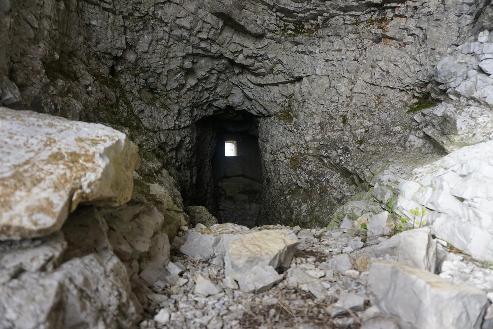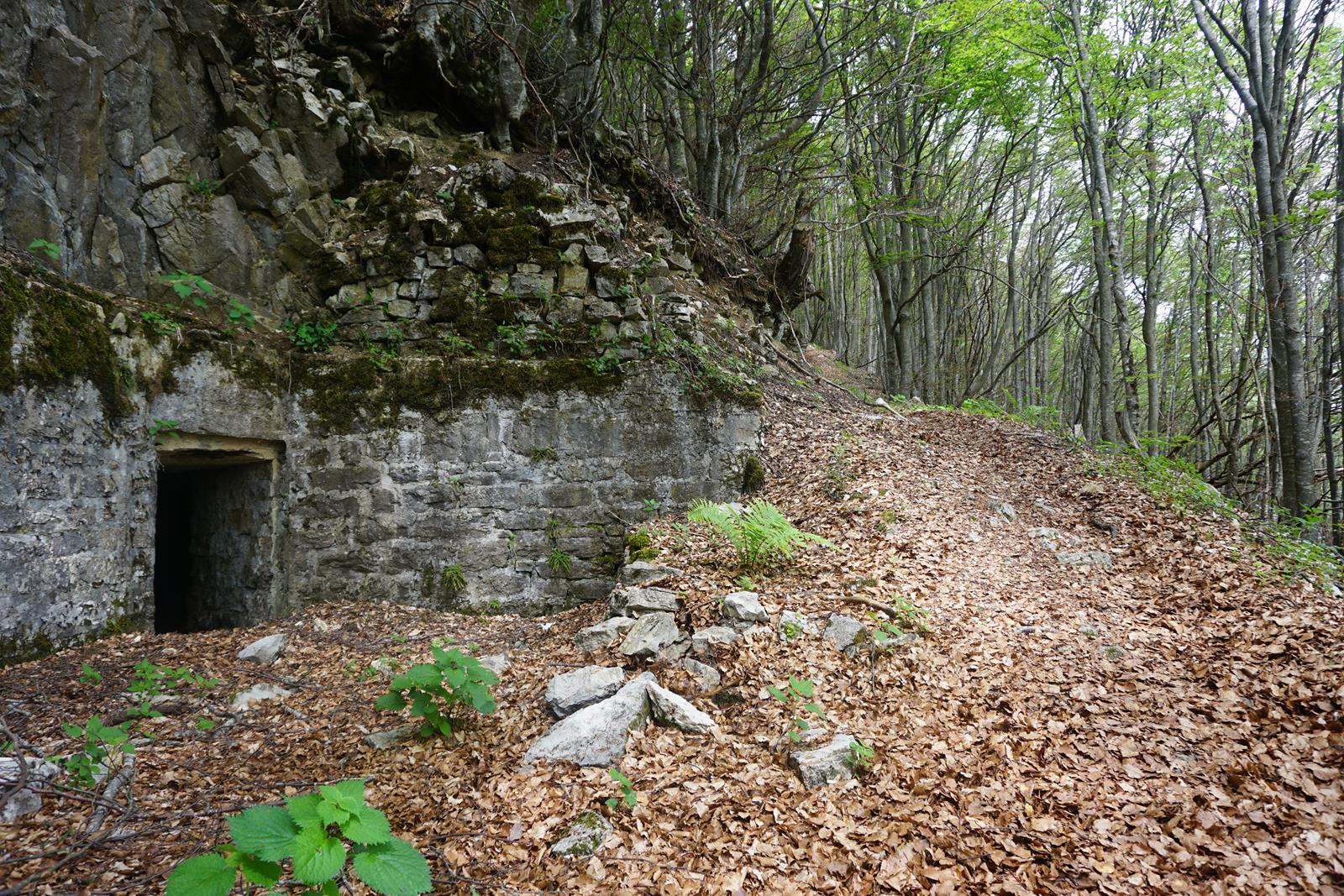 Am Grabeneingang finden wir einen Beobachtungsposten, in der Tiefe eine Artilleriestellung und Schießscharten für Kanonen. Weiter südlich am Schützengraben sehen wir in Felsen gehauene Unterstände, die Schutz vor den Bombardements der italienischen Artillerie vom Monte Baldo boten. Durch zwei instandgesetzte Schützengräben wandernd geht es Richtung Ronzo-Chienis. Noch vor Erreichen der Ortschaft wenden wir uns nach links, um zum Ausgansort St. Barbara (4) zurückzukehren.