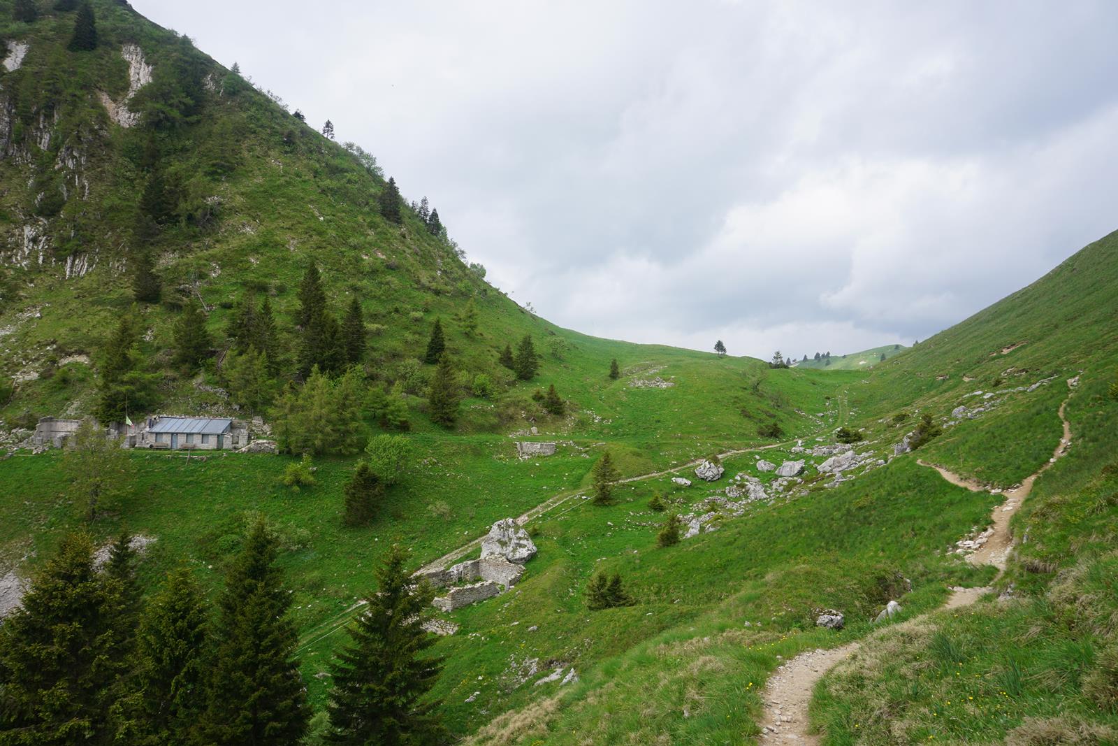 Von Campi (1) aus wandern wir in nördlicher Richtung vorbei an der Malga Grassi bis zur Bocca di Trat (2) und weiter bis zum Rifugio Nino Pernici (3). Von hier aus wendet sich der Weg hinauf in Richtung Bocca Saval. Immer wieder treffen wir auf alte Stollen am Wegesrand. Ein schmaler Pfad schlängelt sich zunächst durch den Wald, später am Hang entlang. Nach etwa 40 min erreichen wir die Bocca Saval (4). Wir passieren Weltkriegs-Ruinen, die von der strategischen Wichtigkeit der Bocca Saval zeugen. Hier befand sich ein Abschnittskomando, ein Lazarett sowie einige Seilbahnen.