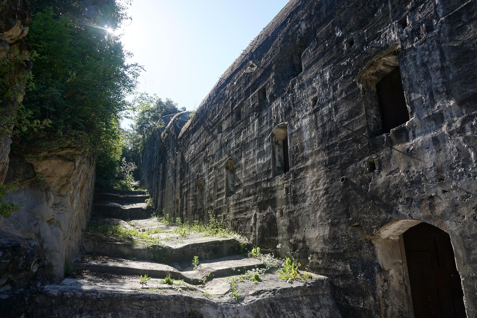 Wir starten unsere Tour in Riva del Garda (1) und nur die aufmerksamen Wanderer sehen in dem Restaurant am Ortsrand etwas unterhalb der Straße nach Limone das, was es einmal ausgemacht hat: Einen 1909 erstellten Batterieblock in Betonbauweise, teilweise in den Fels getrieben. Er war Teil des Sperrriegels Ponale. Auf der gewundenen Ponalestraße (2) setzen wir unsere Erkundungstour weiter fort und laufen auf historischen Wegen, die lange vor dem dem 1. Weltkrieg erschaffen wurden, nämlich zwischen 1782 und 1851. Die Ponalstraße war zu dieser Zeit ein wahres Meisterwerk der Baukunst, das durch in den Berg gehauene Tunnel und Kehren hervorstach. Lange vor dem 1. Weltkrieg schufen die Österreicher Stollen und Schützengräben, die heute noch klar erkennbar über den Weg wachen. Die Ponalestraße wurde im 1. Weltkrieg als Straßensperre genutzt und mit der Zeit zu einer Festung ausgebaut.