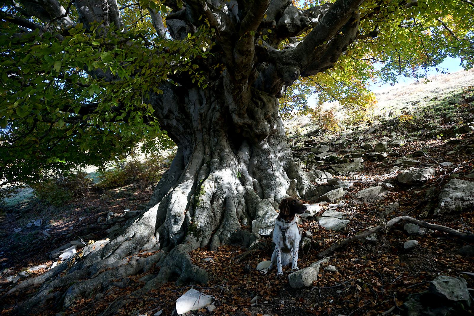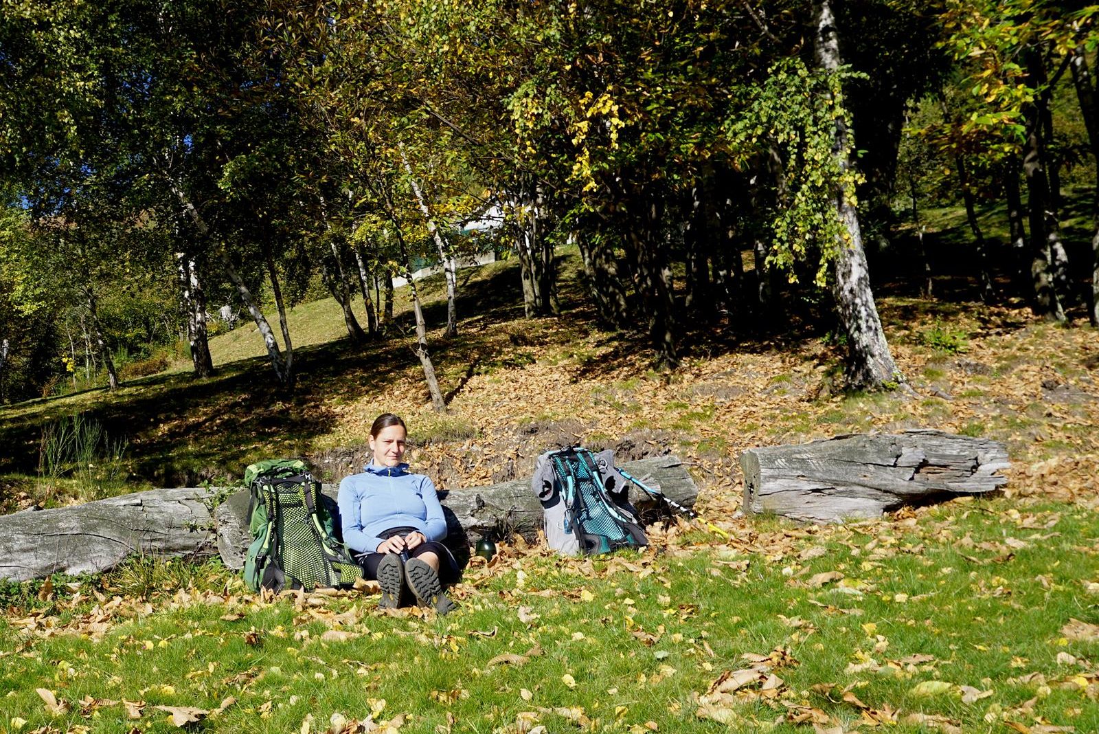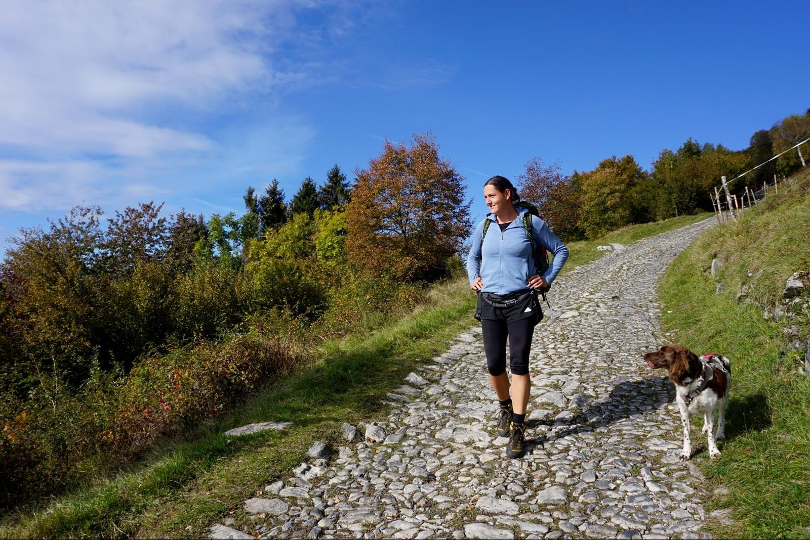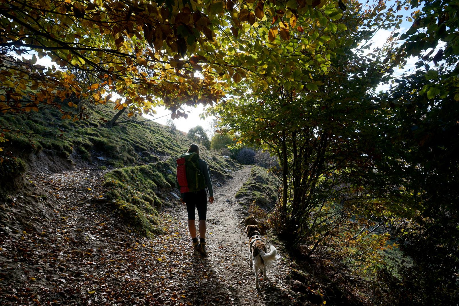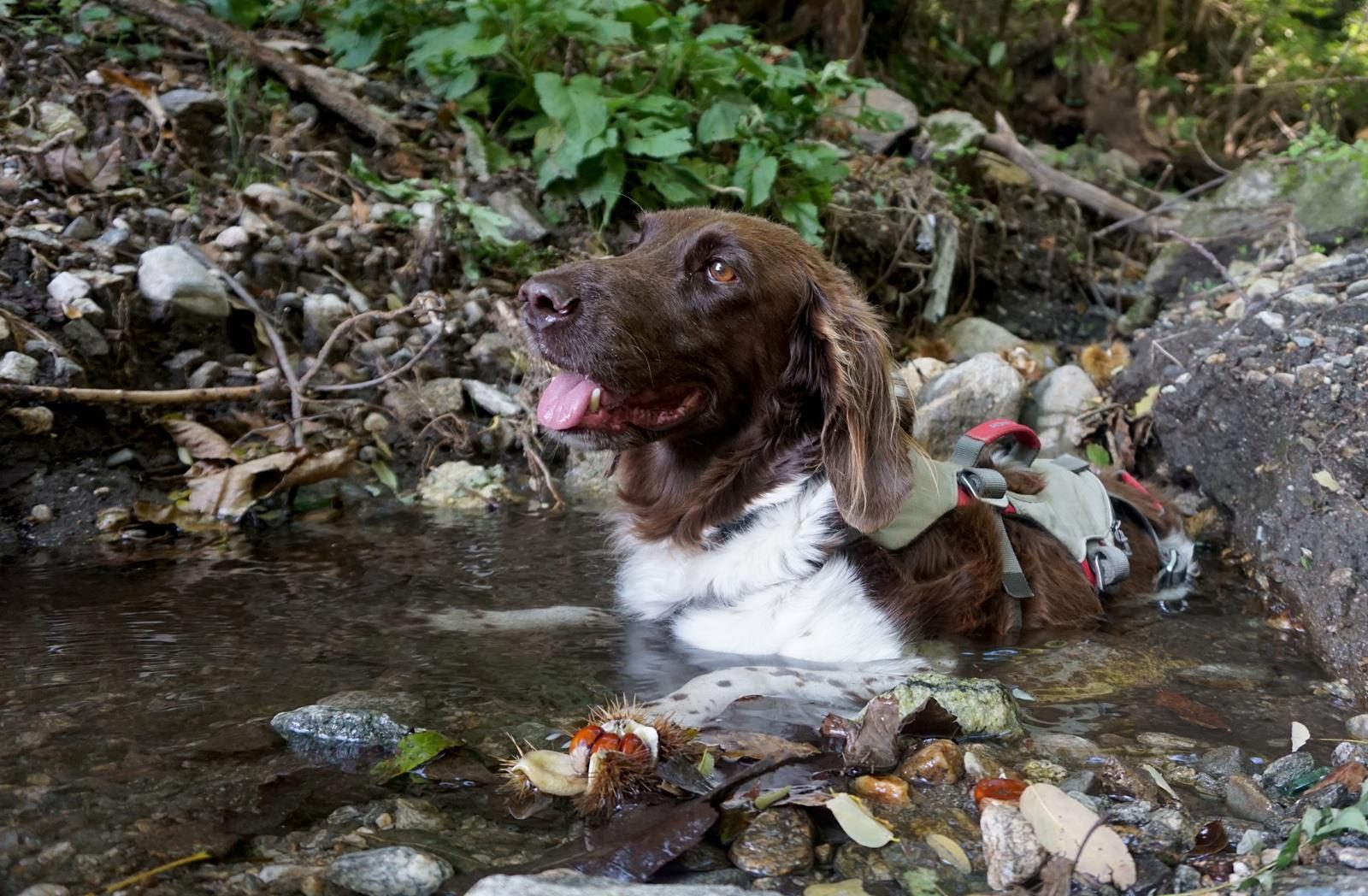 Ein bisschen Hilfe auf den ersten Etappen bei Flussquerungen kann bei etwas weniger beweglichen, älteren Hunden notwendig sein. Im Herbst sahen wir uns einem weiteren Problem ausgesetzt: Esskastanien. Gerade bei den ersten Etappen bedeckten die stacheligen Früchte immer wieder den ganzen Weg und sorgten für einen wahren Eiertanz unserer Münsterländer-Dame. Für empfindliche Hunde sollte im Herbst ein Pfotenschutz mitgeführt werden. Auf den ersten Etappen gibt es genügend Wasserstellen, in denen sich der Hund erfrischen kann. Die letzten Etappen sind etwas trockener, so dass zusätzlich Wasser zum Saufen mitgeführt werden muss.