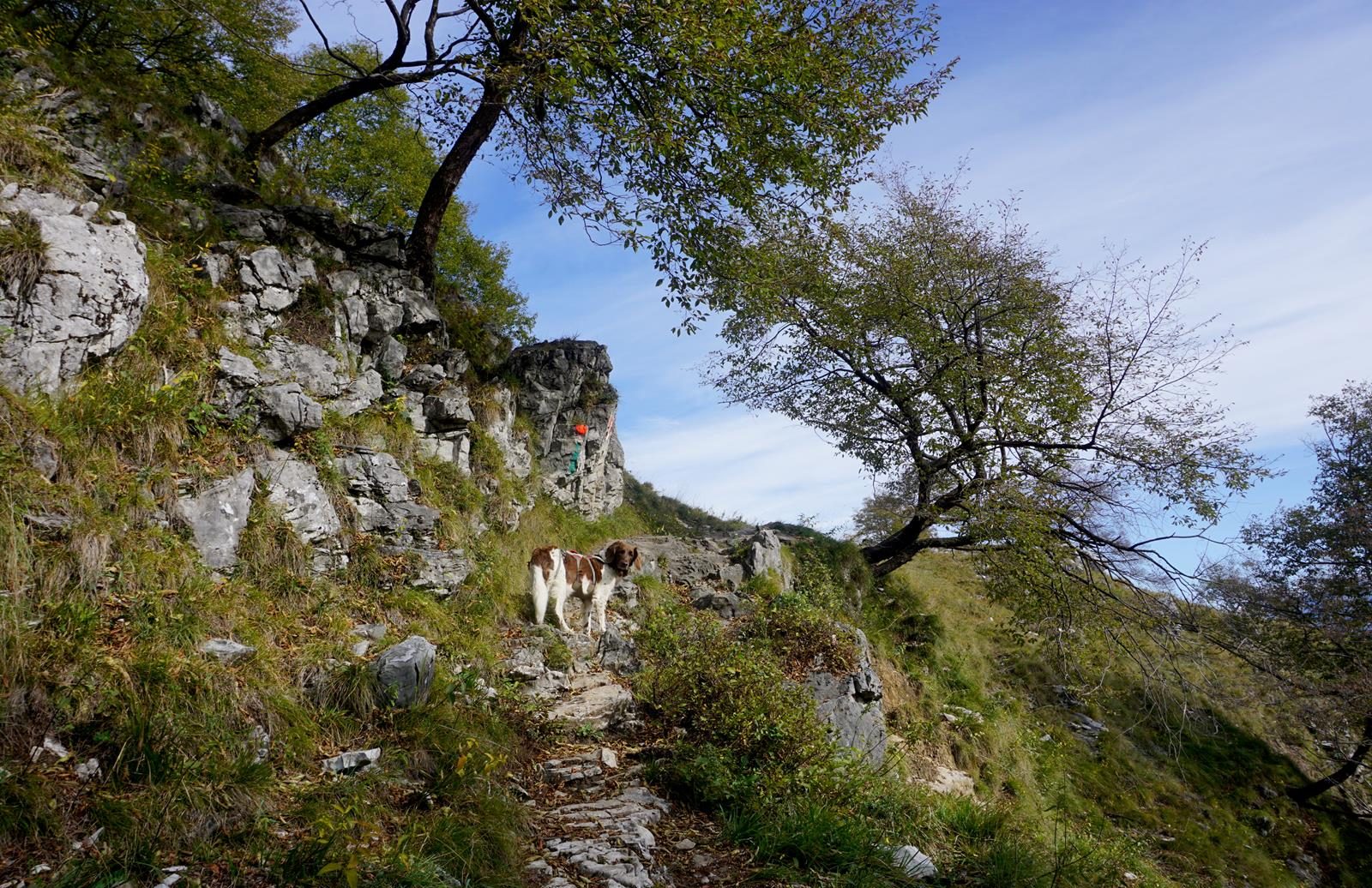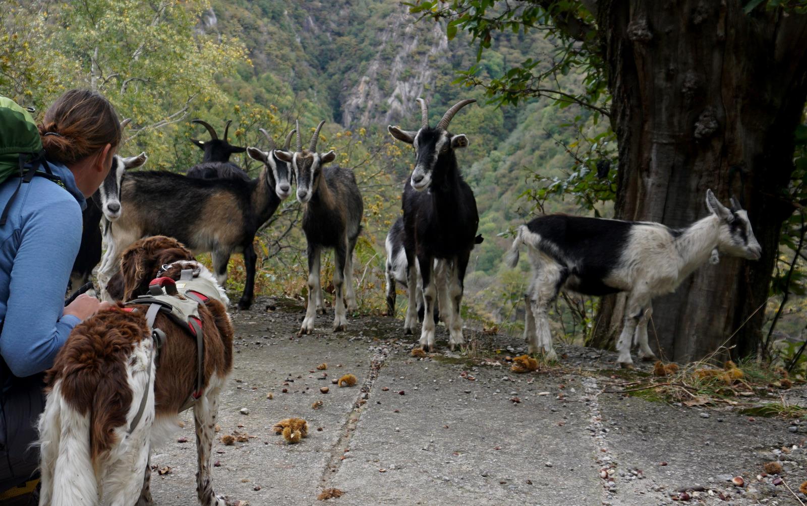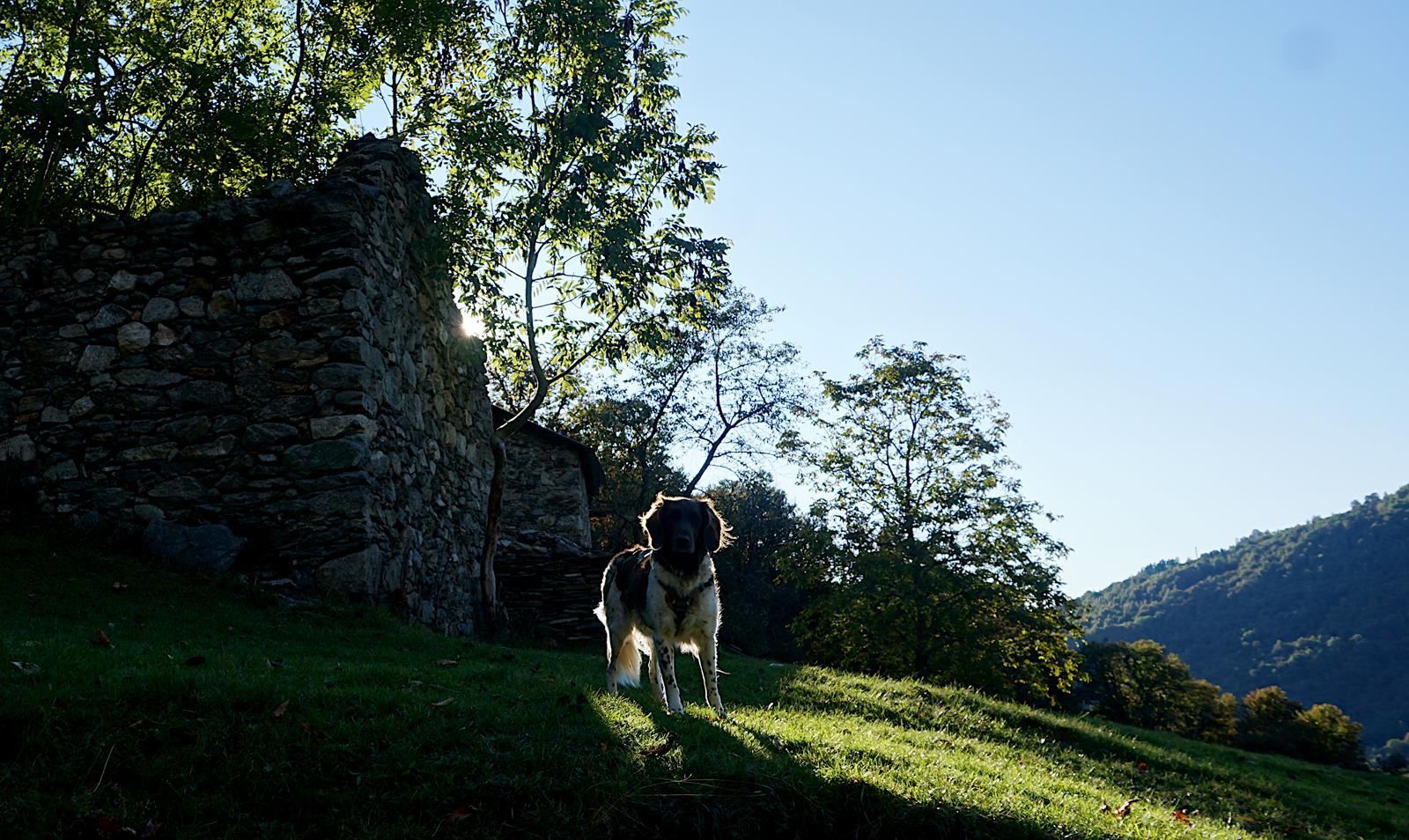 Ab der Crotto Dangri wird der Weg wieder zahmer und führt zunächst auf einem breiten Fahrweg erst nach Livio (4), dann nach Peglio (5) und dann weiter auf kleinen Pfaden durch den Wald nach Dosso del Liro (6). Wir begegnen das zweite Mal an diesem Tag einer richtigen Horde freilaufender Bergziegen, die sich scheu und neugierig zugleich vor allem für Wanderhund Lotte interessieren. Außerdem gingen wir heute auf Tuchfühlung mit Pferden, Kühen, Eseln und Schafen.