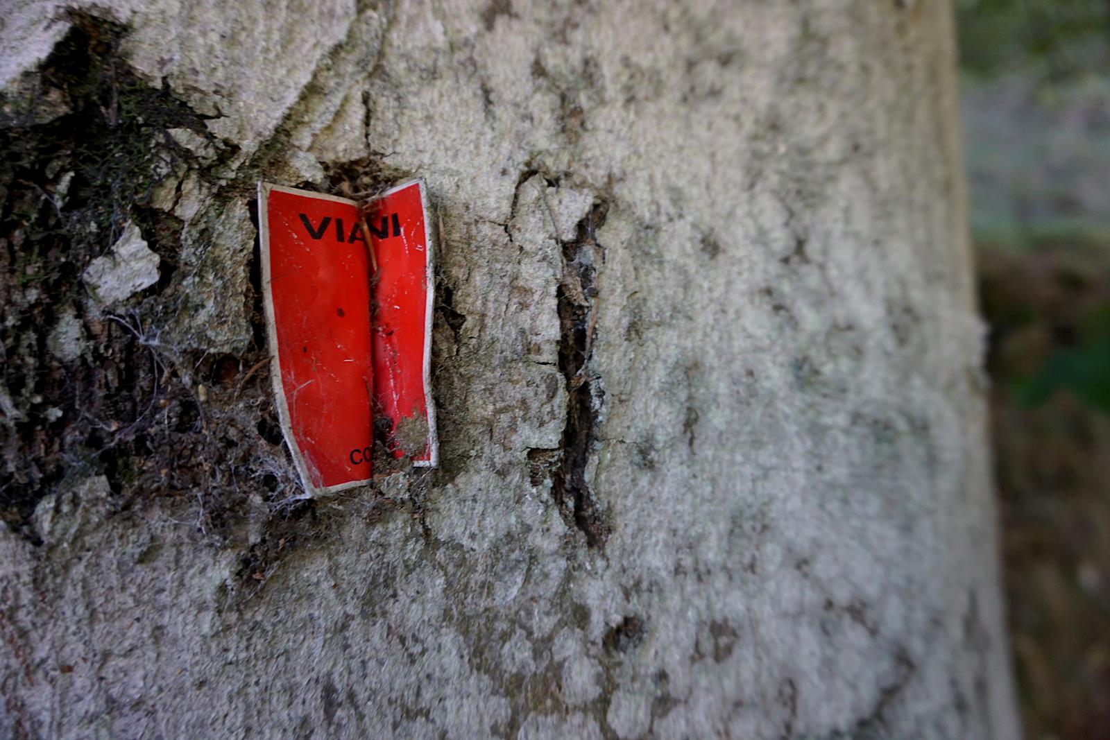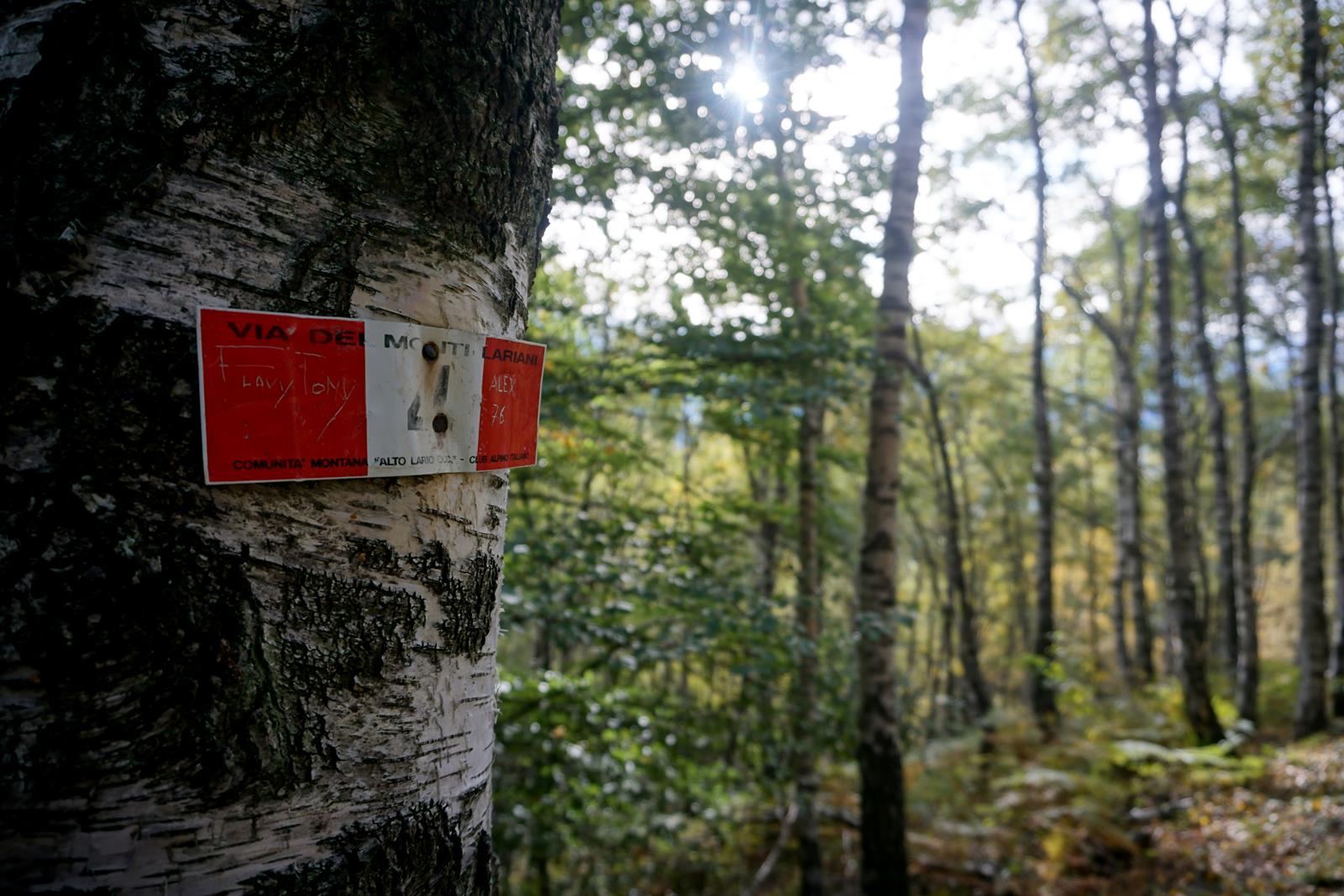 Einen Wanderführer zur Fernwanderung gibt es nicht, ebenso wenig eine empfehlenswerte Karte. Ich bin eigentlich ein Fan der guten alten Wanderkarte, bin den Via dei Monti Lariani aber komplett mit digitaler Navigation von komoot gelaufen. Die hilft auch, wenn man – was auf jeden Fall passiert – den Weg nicht findet, zurück zu ebendiesen zu finden. Der Weg ist zwar markiert, aber sehr unregelmäßig. Das beste Rezept zur Wegfindung: Man laufe um jeden Baum, Brunnen und um jede Alm, um die spärlichen Wegweiser zu finden. Zudem hilft die Orientierung an Steinmännchen, Punkten, Flatterband und Holzschildern. Die Metallschilder scheinen hin und wieder ergänzt zu werden, einige jedoch hat sich die Natur im wahrsten Wortsinn schon einverleibt. Grundsätzlich gilt für die ganze Tour: Die Markierungen zwischen den Wegpunkten (im Text fett und mit Zahl in Klammern) sind eine gute Orientierungshilfe.