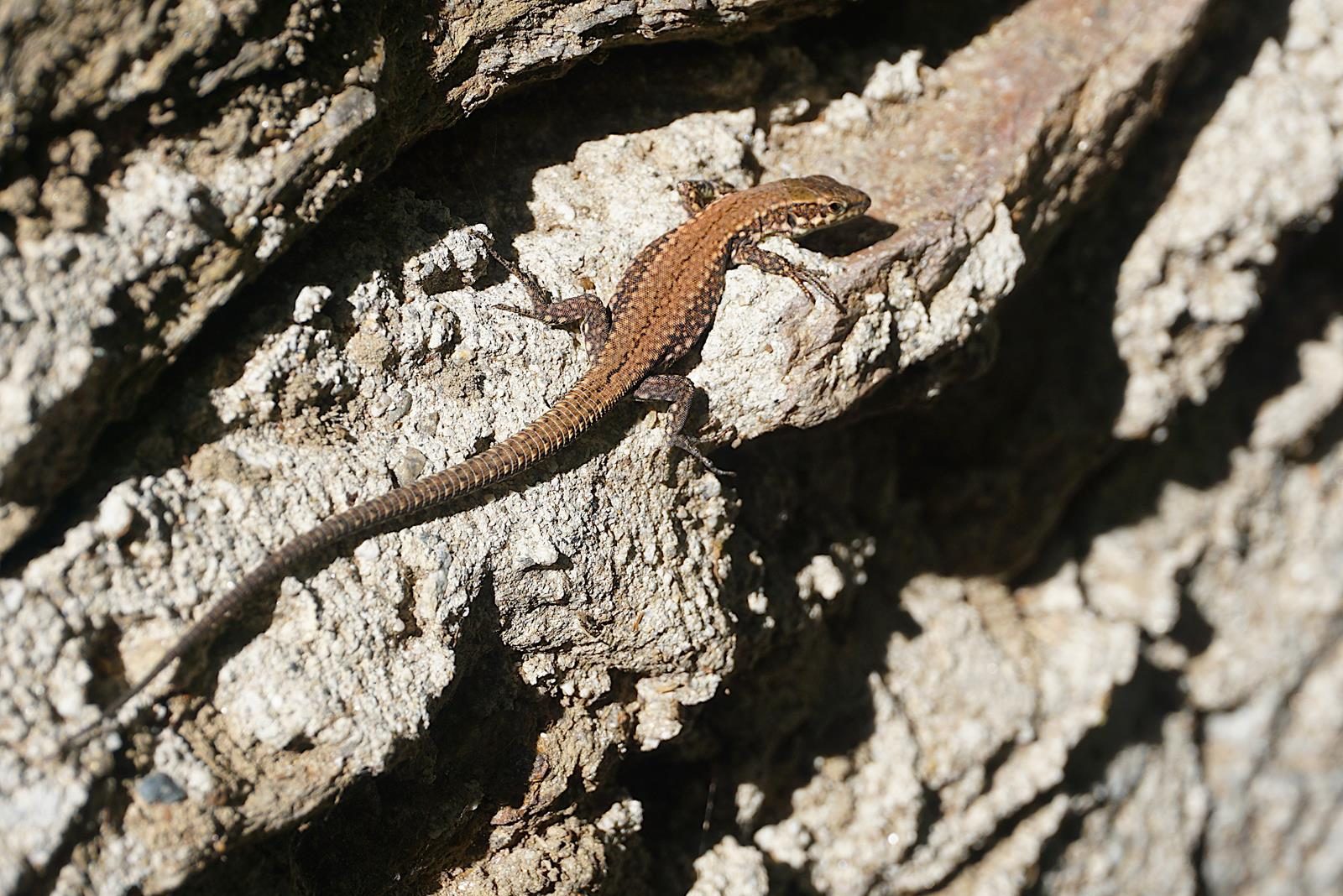 Später werden wir eine weitere passieren, aber dann war es das auch schon wieder mit den Brücken. Auf unserem Weg nach Ceresa (3) und Boiena (4) geht das mit dem Verirren und durch Flüsse-waten fröhlich weiter. Die Markierungen sind dürftig, aber manchmal weist uns ein Punkt, manchmal ein Steinmännchen oder ein vom Baum halb aufgegessenes Blechschild den Weg. Und manchmal rettet uns nur die Navigationsapp. Ohne sie würde ich vermutlich immer noch auf der Via dei Monti Lariani rumirren. Aber das alles stört kaum, wenn man seine Pausen an eine Steinmauer gelehnt in der wärmenden Oktobersonne verbringen kann, das Leben in seiner schönsten Form genießen und die Aussicht mit niedlichen Echsen teilen darf.