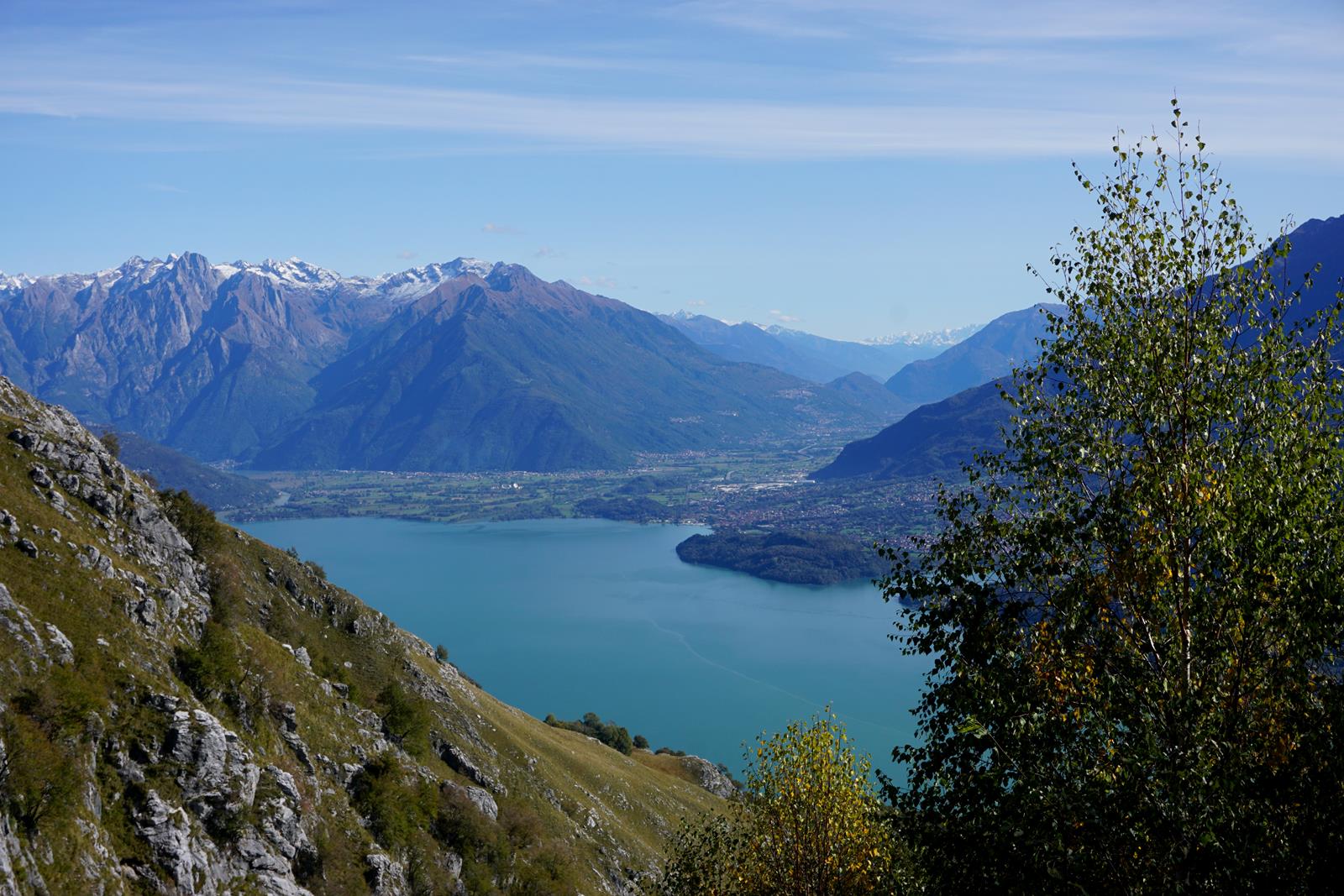 Wir uns übrigens auch. Denn immer, wenn wir unseren Blick von den niedlichen Viechern abwenden, erwarten uns tolle Weitsichten. Nur einen Katzensprung entfernt nämlich enden die Alpen und die italienische Poebene beginnt. Im nächsten Moment stehen wir am wohl schönsten Punkt der gesamten Via dei Monti Lariani. Am Aussichtspunkt Ermogna (3) liegt uns eindrucksvoll der Comer See in Richtung Norden zu Füßen. Dahinter ragt der 4000 Meter hohe Piz Bernina der Schweiz auf.