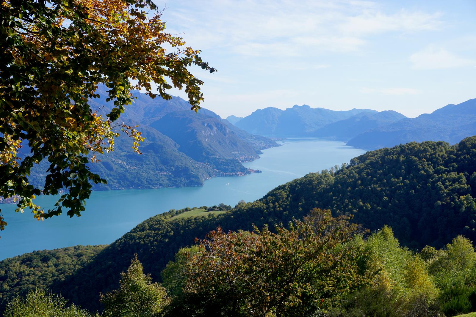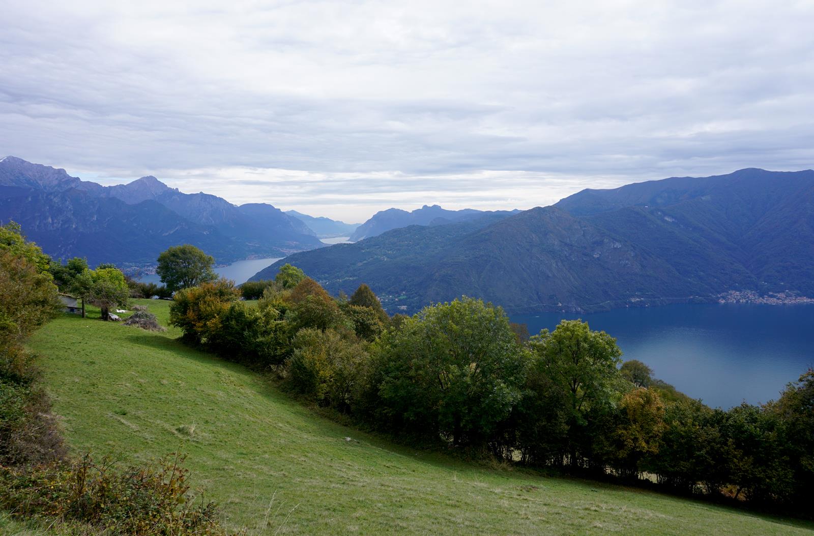 Als wir schließlich auf dem 1140 Meter hohen Berg stehen, erwartet uns eine phänomenale Aussicht über den Comer See. In Kombination mit der wärmenden Sonne hätte ich hier ewig sitzen können. Die hohen Berge im Norden, gezuckert vom ersten Schnee, das noch nicht zu erkennende Südufer und die sich langsam bunt färbenden Laubbäume – der Gipfel des Sasso di Musso ist definitiv einer der schönsten Plätze des ganzen Weges. Wir streifen vom Gipfel zum deutlich erkennbaren Kirchlein San Bernardo (3) über grüne Berghänge und machen uns dann aussichtsreich an einen Teilabstieg. Hin und wieder verschwinden wir im Wald und wenn wir aus ihm heraus auf eine Lichtung treten, hat sich die Perspektive auf den See wieder einmal geändert.