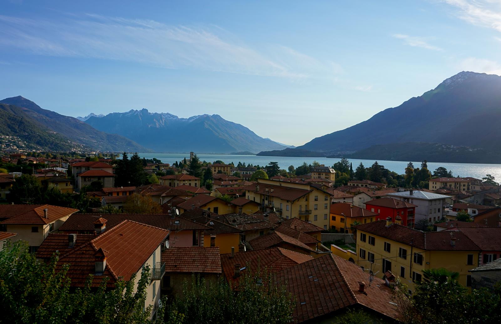 Insgesamt passieren wir vier Ortschaften auf dem Weg zu unserem Tagesziel: Piazzo (2), Dolo (3), Bugiallo (4) und Peledo (5). Es sind nicht viel mehr als kleine Ansiedelungen, die durch steinige und stufige Pfade oder Wiesenwege miteinander verbunden sind. Die Sonne steht schon tief, als wir unser Ziel Fordeccia (6) erreichen und hüllt alles in ein mildes Licht. Knapp 900 Höhenmeter trennen uns nun von unserem Ausgangsort Sorico, der malerisch zu unseren Füßen liegt. Und irgendwo dahinten, am anderen Ende des Sees, wollen wir in acht Tagen unsere Reise beenden.