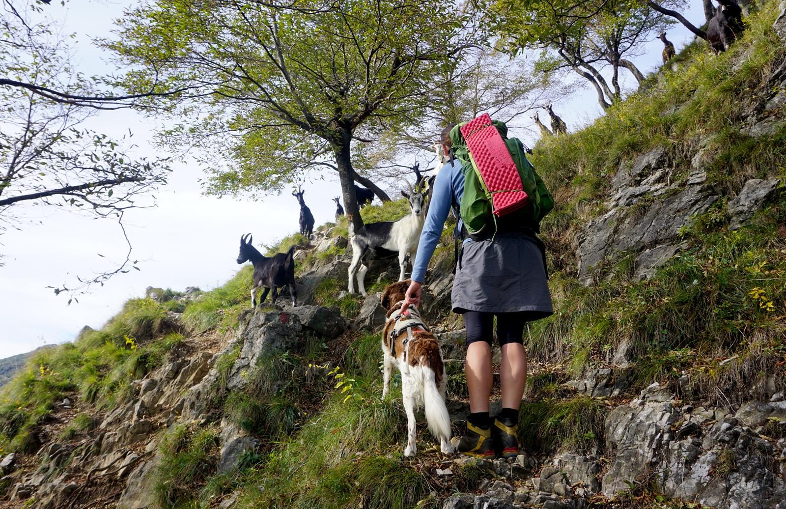 Womit man auf der Via dei Monti Lariani immer rechnen muss, sind Tierbegegnungen. Esel, Kühe, Schafe, Pferde, Hühner vor allem aber Bergziegen trifft man auf nahezu jeder Etappe. Allerdings sind die Almtiere nirgends entspannter als in Italien – das habe ich schon viele Male festgestellt. Die tierische Form des Dolce Vita sozusagen. Auch die Tiere pflegen einen Lebensstil voller Lässigkeit und Lockerheit, fernab von Stress und Hektik.