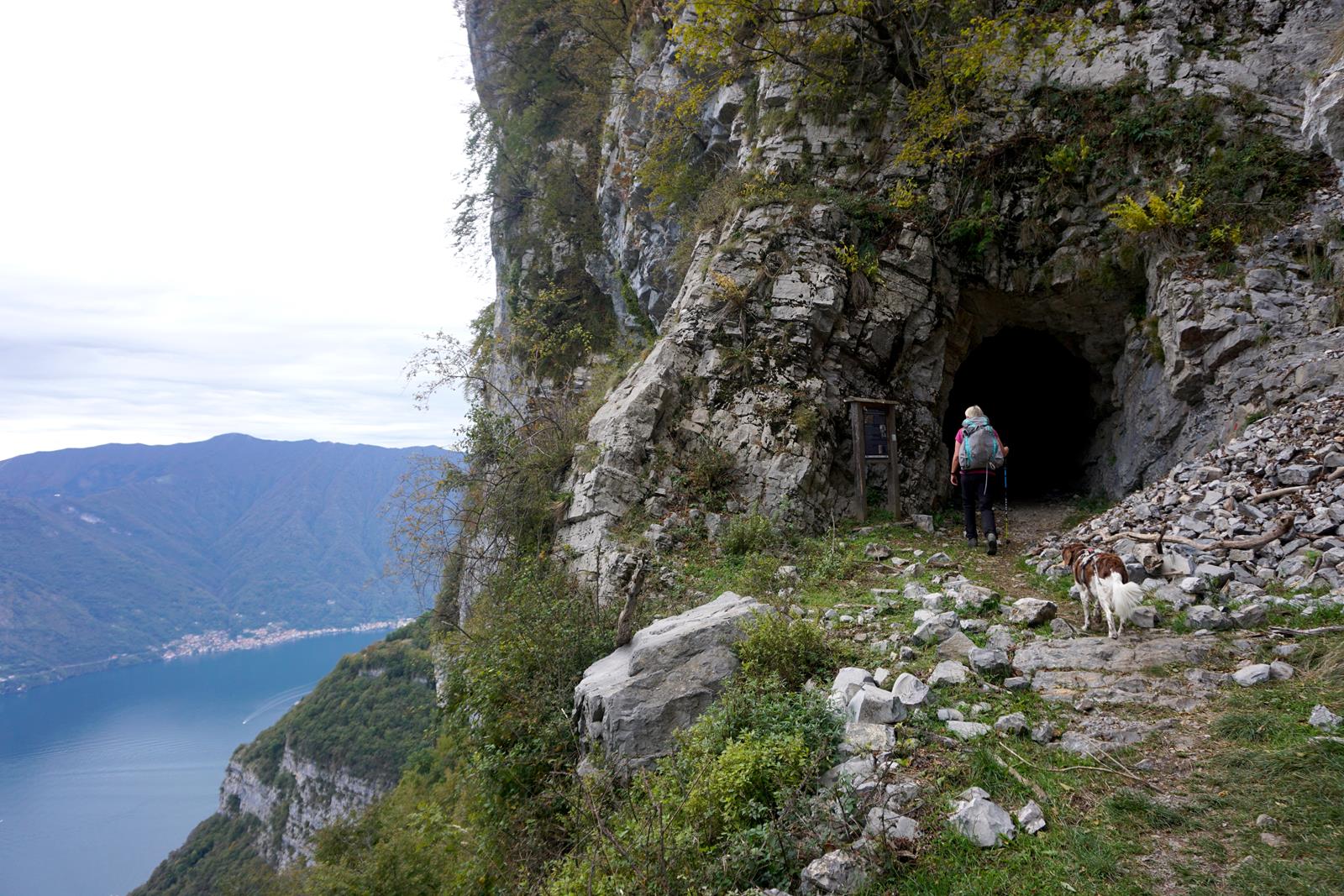 Die Wege sind immer noch gut ausgebaut, erstaunlich gut zu finden und führen mich zu einer Steilklippe. Untenrum? Obenrum? Mir war erst nicht klar, wie ich wohl an ihr vorbeikommen würde, aber andere hatten sich da 100 Jahre vor mir schon den Kopf zerbrochen. Die Antwort: Mittendurch. Von Weitem nicht zu erkennen, führte der Weg durch einen 120 Meter-langen Tunnel mitten durch den Berg. Die Galleria del Tremezzo (6) erinnerte mich sofort an die Kriegsschauplätze auf dem Sentiero della Pace und ich habe recht: Dieser lange Tunnel am Monti Brente – zwischen 1916 und 1917 fertig gestellt – wurde vorsorglich in Erwartung eines Kriegseintrittes der Schweiz in den 1. Weltkrieg gebaut und war Teil des Verteidigungsriegels Italiens nach Norden.