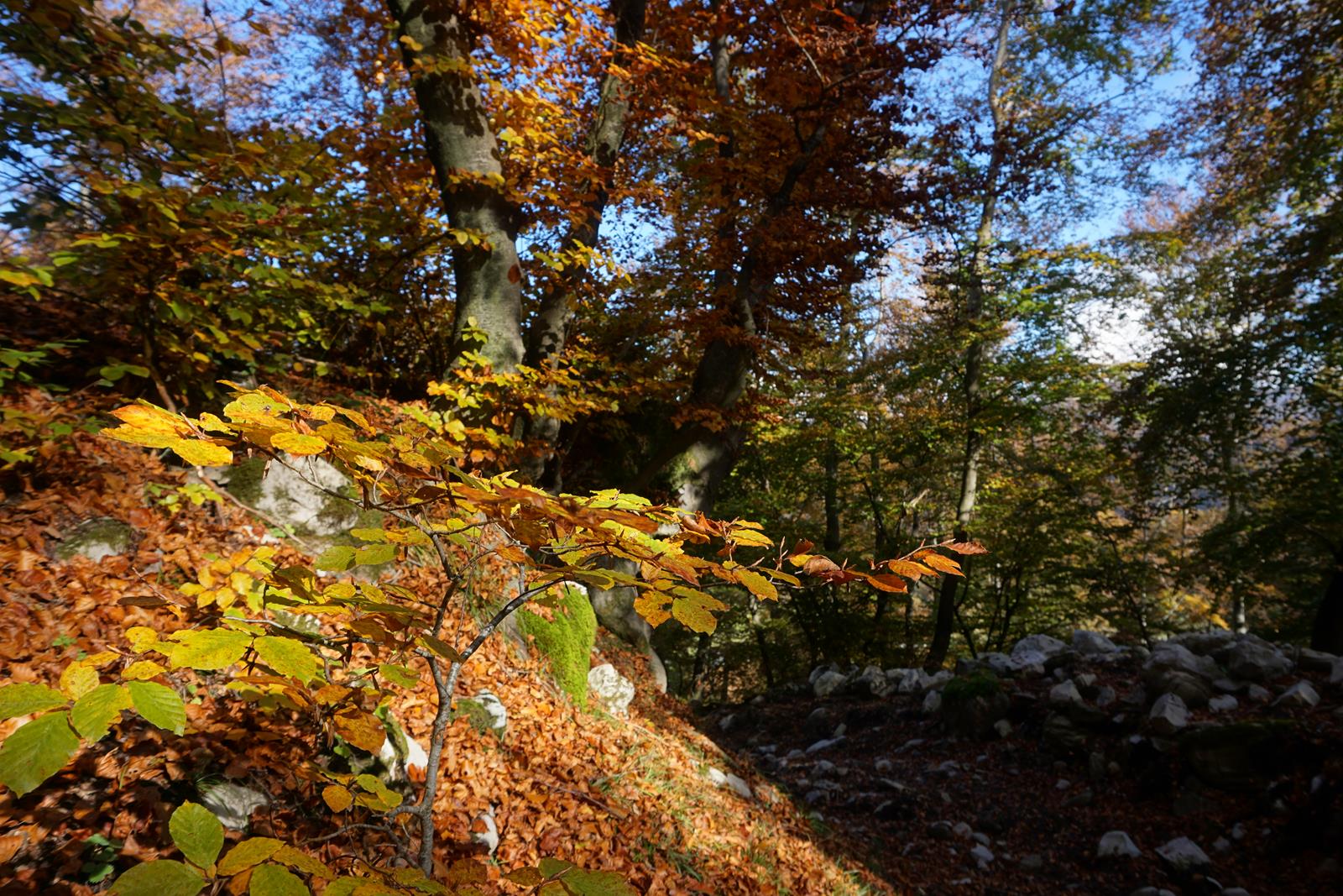 Irgendwann im Laufe unserer Wanderung ist landschaftlich aus dem Spätsommer ein früher Herbst geworden. Ich habe das Gefühl, dass mit jedem Schritt die Wälder bunter werden. Diese werden nun wieder etwas mehr, auch wenn sich immer wieder aussichtsreiche Teilstrecken unter die Waldpfade mischen. Viele Stunden und eine Ehrenrunde später – ein Waldpfad war kaum mehr zu passieren und wir entschieden uns für die ausgebaute Variante „obenrum“ – erreichen wir die Festung Gordona (4). Diese, gefühlt mitten im Nichts stehende, Festungsanlage stammt wie zwei Tage zuvor der Tunnel ebenfalls aus dem 1. Weltkrieg. Ab hier ist es noch etwa eine Stunde bis nach Morico (5).
