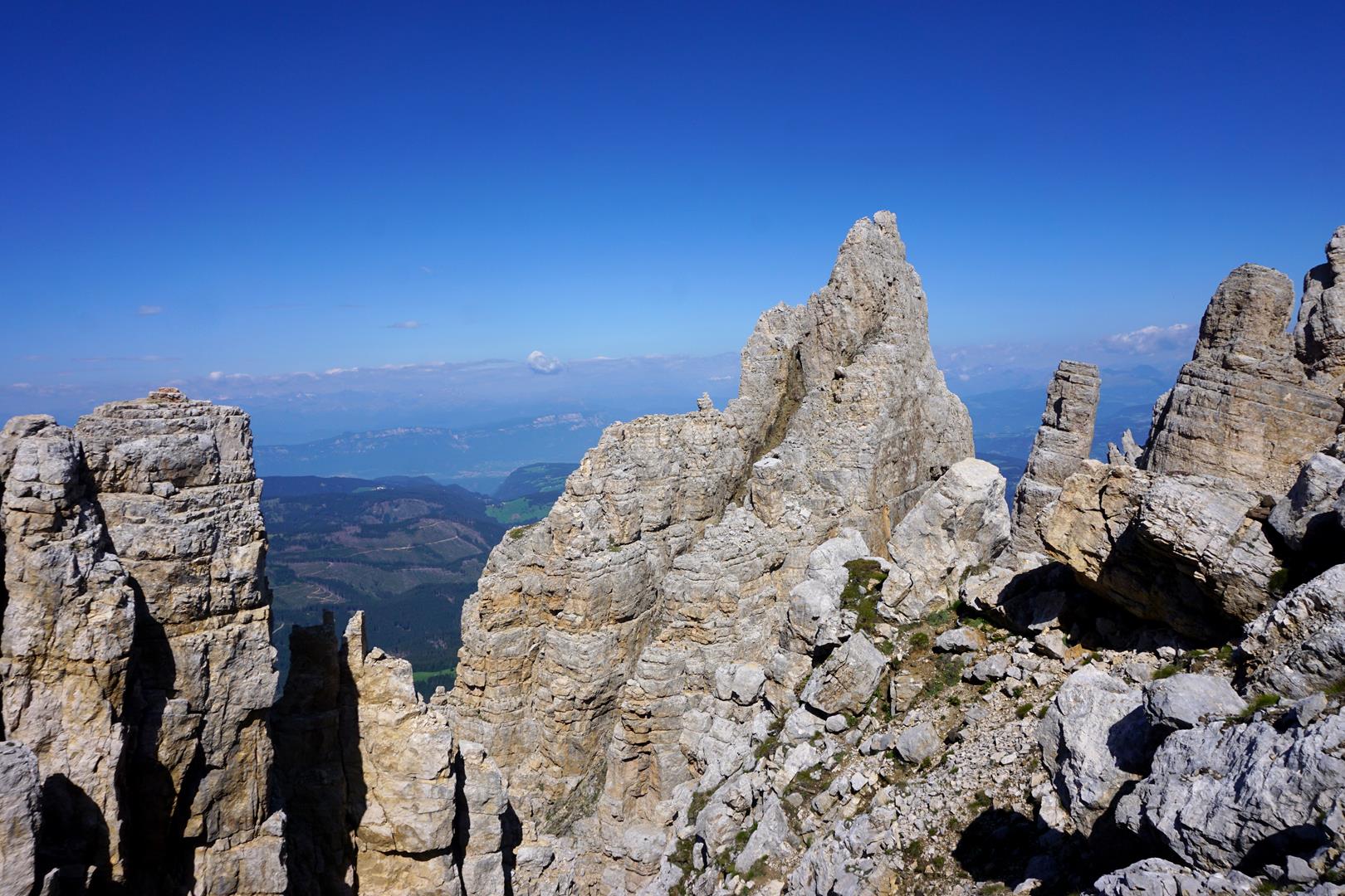Der schwierigste Teil meiner Latemar Überquerung liegt aber noch vor mir. Nachdem ich rasch zur Kreuzung zurückgekehrt bin, geht es zwar nur sanft hinab, aber der Weg hat es in sich. Mit viel Gleichgewichtssinn balanciere ich auf den schmalen Felsbändern, rutsche auf meinem Hinterteil steile Felsen hinab und versuche immer nur dann weiterzugehen, wenn ich sicher bin, auf dem richtigen Weg zu sein. Die Sonne steht hoch und ich kann gar nicht ausmachen, ob es die Anspannung oder die heißen Sonnenstrahlen sind, die mir die Schweißperlen auf die Stirn treiben. Ich brauche lange, um schließlich zur erlösenden Weggabelung zu kommen.