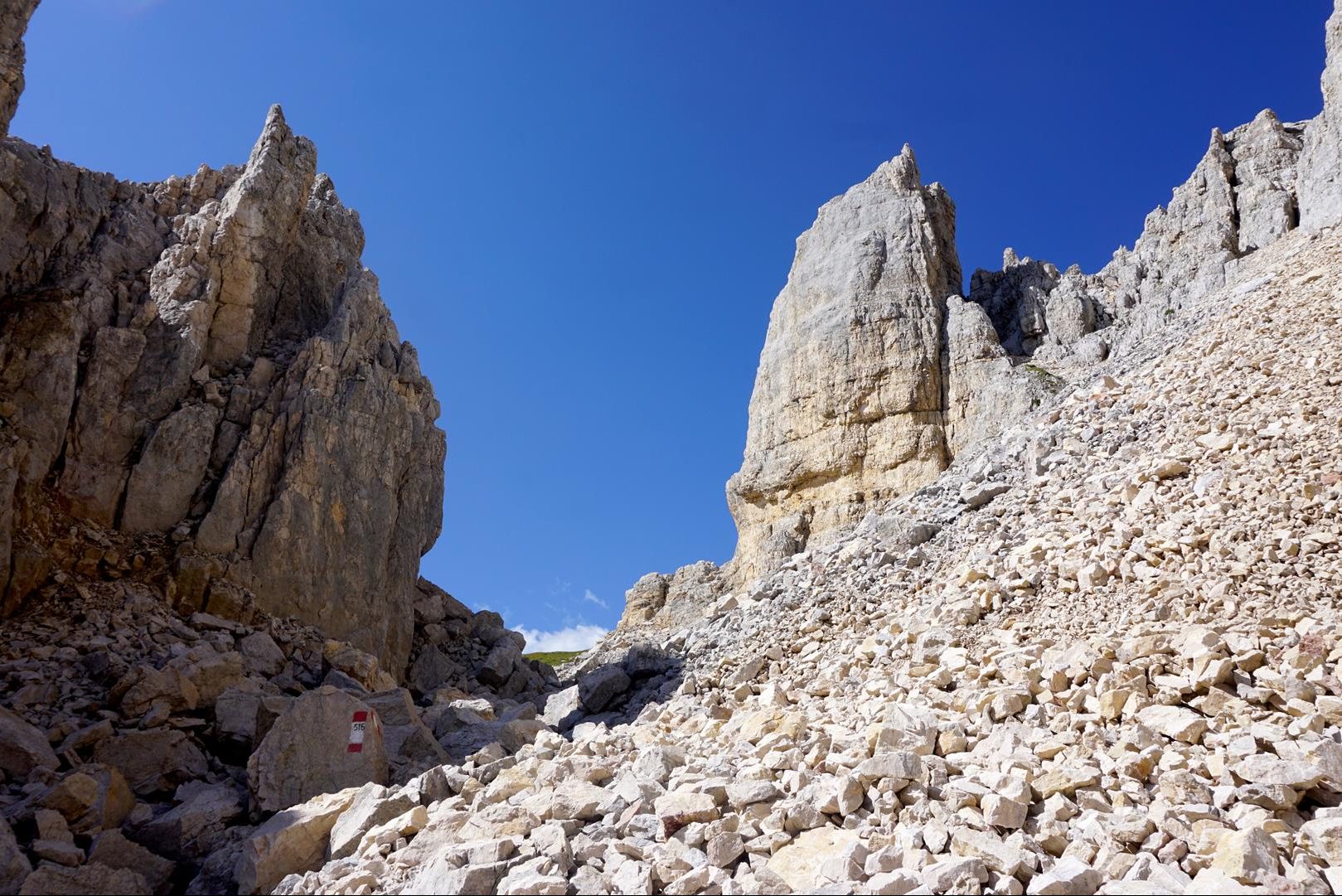 Ich komme schließlich am Rifugio Torre di Pisa (2) mit dem guten Gefühl an, die erste Hälfte des Anstiegs ohne große Anstrengungen geschafft zu haben. Wie die meisten Gäste zieht es mich an Rifugio zum Aussichtspunkt, der einen perfekten Blick auf den Torre di Pisa, einen 20 Meter hohen Felsturm, der dem Rifugio seinen Namen gibt und an den berühmten Schiefen Turm von Pisa erinnert. Während die meisten Wanderer damit ihr Tagesziel erreicht haben, schlage ich nun erst einmal den felsigen Weg hinab ein.