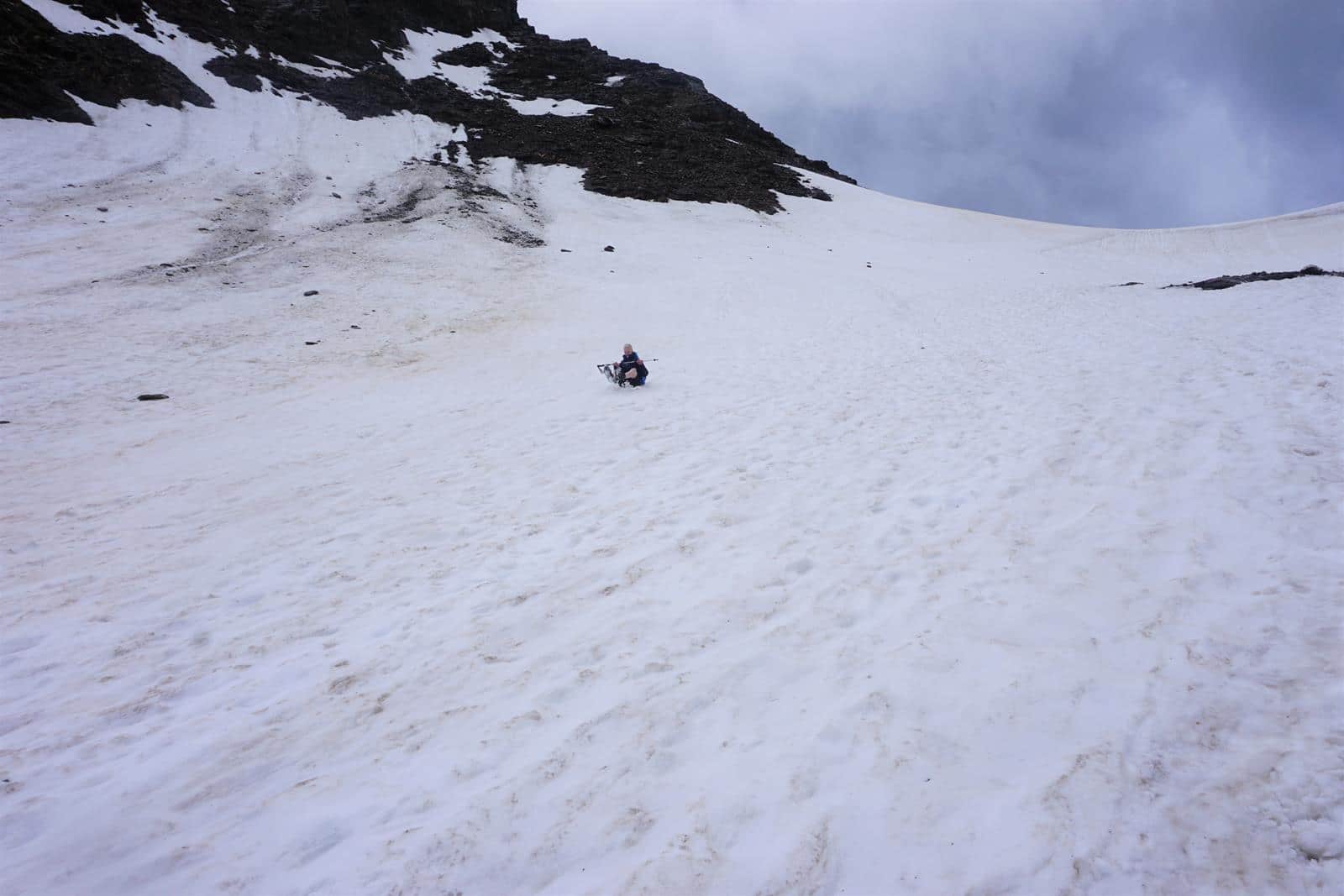 Auf der anderen Seite des Jochs erwartet uns die doppelte Portion kaltes Weiß. Die ganze Rinne liegt voll mit Schnee. Es dauert nicht lang und da rutsche ich aus und lege flott – kichernd, weil nicht gefährlich – 50 Höhenmeter zurück. Das ist unsere Abstiegsmethode der Wahl, was ein Spaß! Schließlich sind wir eh schon nass. Als ich dann noch halb rutschend vor mir die 3022 Meter-hohe Wurmaulspitz sehe, auf der ich im letzten Herbst stand, bin ich völlig hin und weg. Zumal die Brixener Hütte (5) schon in Sichtweite ist.