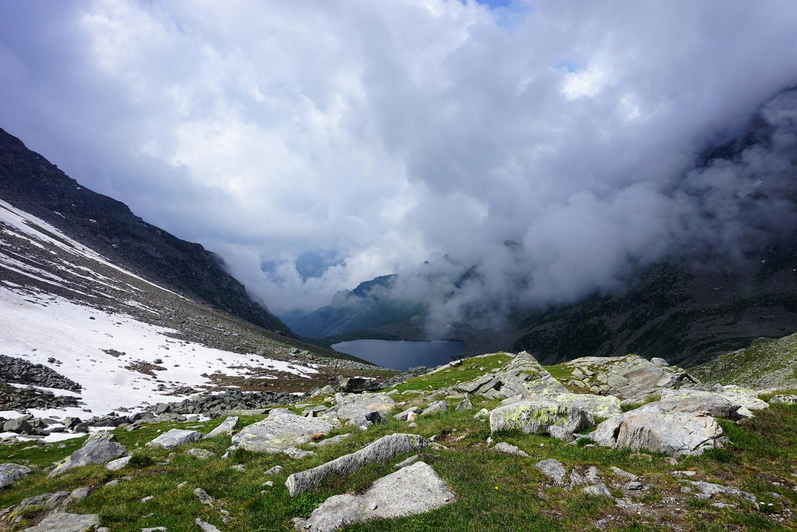 Als wir unsere Wanderschuhe an diesem Tag schnüren, sausen parallel dicke Wolkenschwaden aus dem Tal hinauf zur einsamen Brixener Hütte (1). Etwas, was uns noch den halben Tag begleiten wird. Fast im Minuten-Takt wechseln sich Nebelbänke und feine Aussichten ab. Logisch, dass es erst mal steil und alpin hinauf geht auf das erste Joch, die Steinkarscharte (2). Doch der Abstieg ist mindestens genauso fordernd. Ein dickes, leider ziemlich steiles Altschneefeld will vorsichtig abgestiegen werden. Zudem haben Schneelawinen den späteren Weg zerstört, der nur noch aus losem Schutt besteht.