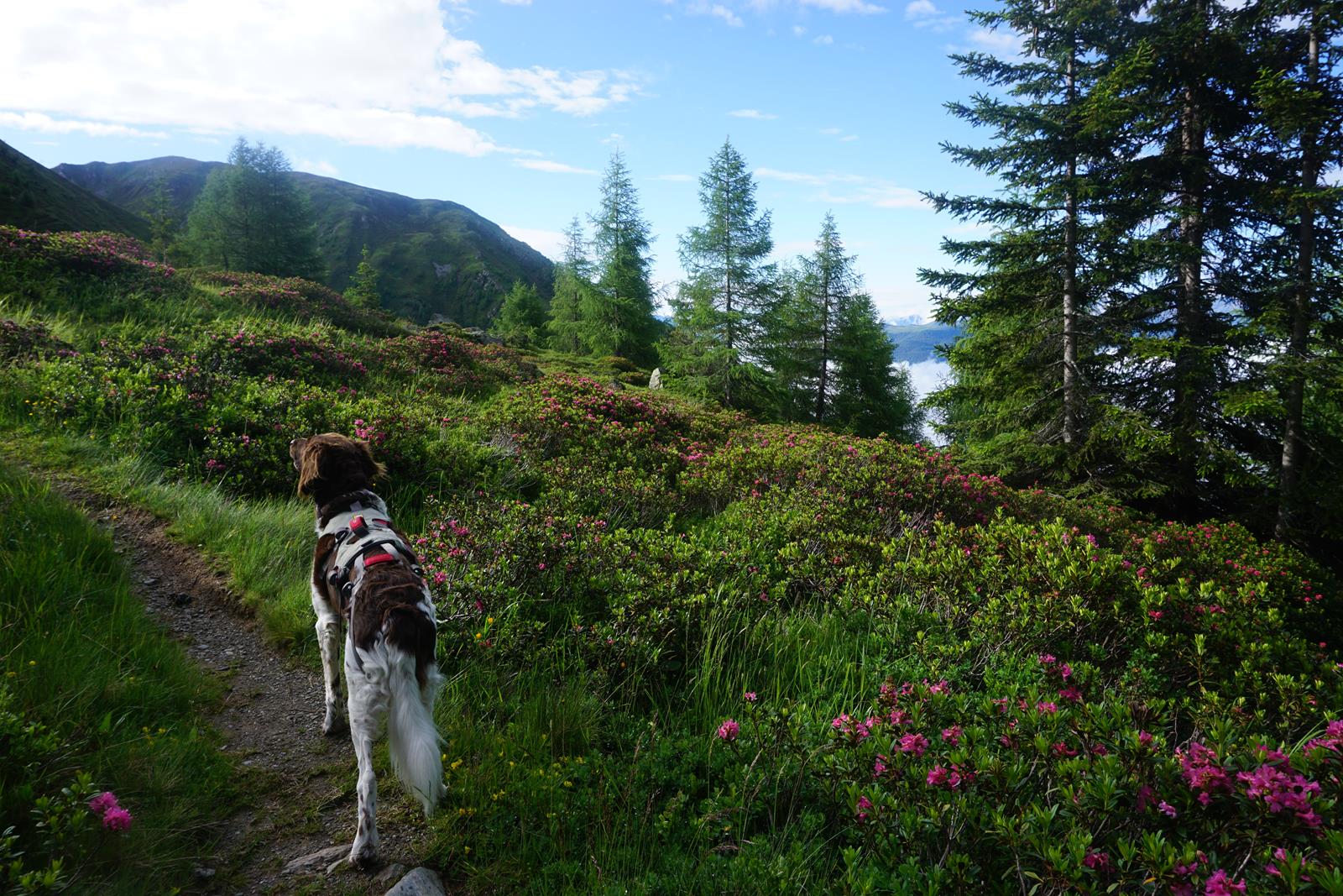 Ein grollender Donner, der durch Mark und Bein zieht, weckt mich aus dem eben erst gefundenen Schlaf. Kurz darauf folgt das laute Fluchen des Hüttenwirts der Tiefrastenhütte (1). Die Elektrik… . Einen warmen Kaffee bekam ich am nächsten Morgen aber trotzdem. Irgendwie hat er’s repariert. Als wir von der Hütte starten, gesellt sich der Almwirt der Hofalm zu uns, der seit 5 Uhr auf den Beinen ist, um zu schauen ob seine Kühe, Schafe und Ziegen das Gewitter unbeschadet überstanden haben. Wir plaudern über dies und das. Warum er keinen Hund hat, dass er sich eine Drohne zulegen will, mit der er Zäune kontrollieren kann, und dass er im Winter oft in Deutschland auf Weihnachtsmärkten unterwegs ist. Nebenbei wabern Wolken im Tal, wir durchwandern ein Meer aus Alpenrosen und steigen schon wieder gemütlich auf.
