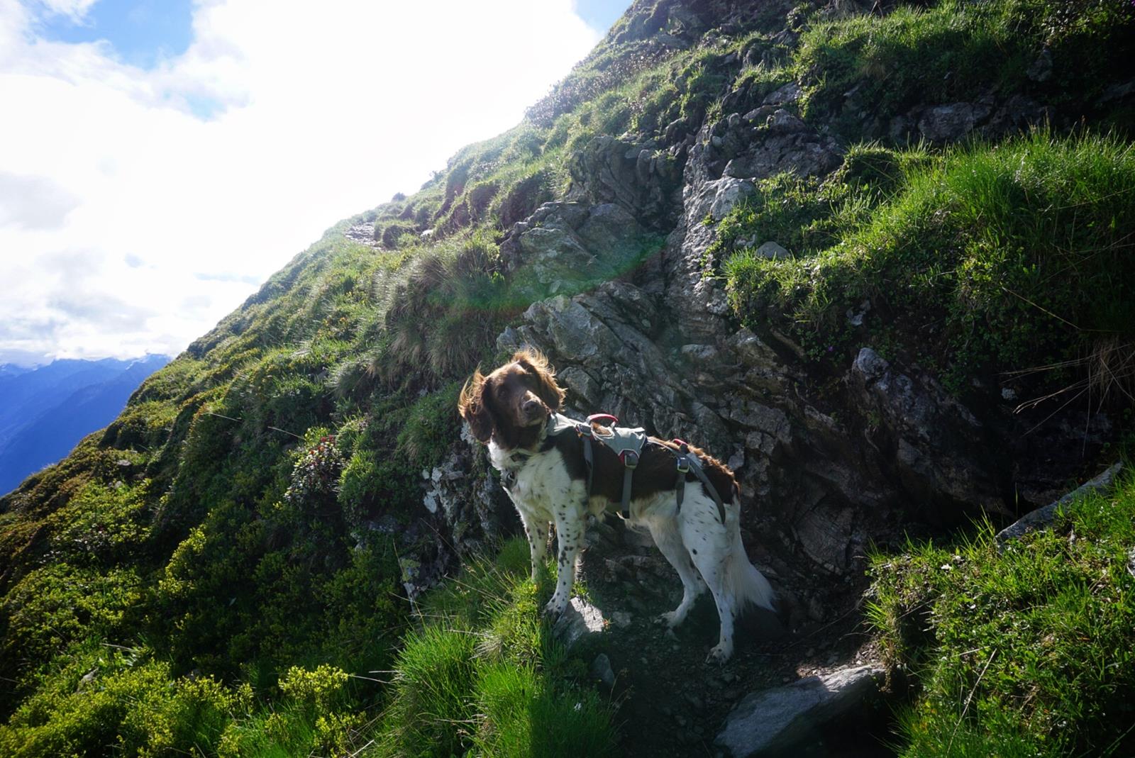 Der limitierende Faktor bei Hüttenwanderungen mit Hund ist ja in der Regel die Unterkünftssituation. Beim Pfunderer Höhenweg kommen noch die technisch anspruchsvollen Passagen hinzu. Nur wer selbst absolut sicher ist und dabei noch seinen Hund sichern kann, sollte den Weg in Angriff nehmen. Dass der Hund selbst auch bergerfahren sein und über eine gute Kondition verfügen muss, versteht sich von selbst. Bei der Gaisscharte muss der Hund über mehrere Meter abgeseilt werden, das geht nur mit einem Kletterseil und einem für diesen Zweck ausgerichteten Klettergeschirr mit Beinschlaufen. Diese Stelle lässt sich jedoch auch umgehen. Mehr als eine Handvoll Hunde wird es wohl bisher nicht über die Gaisscharte geschafft haben.