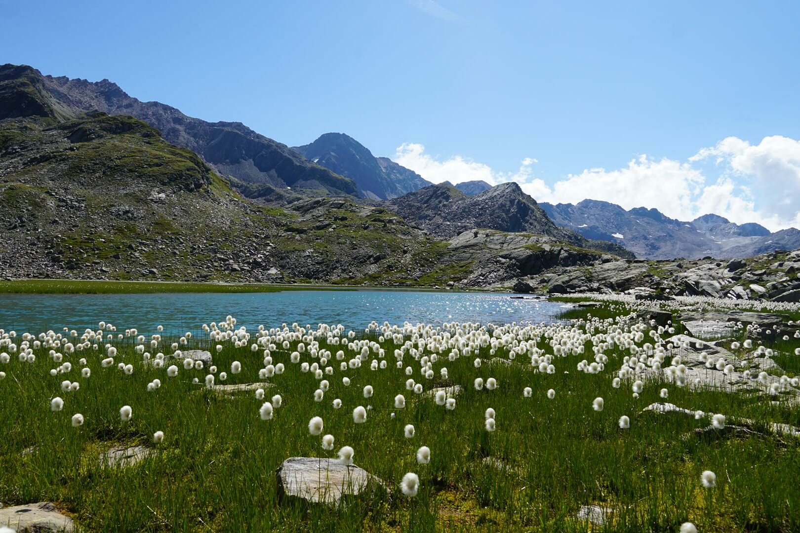 Wir haben nun wieder etwas mehr Grün unter den Schuhsohlen, es pfeift ein Murmeltier und ein Schmetterling fliegt vorbei. Auf bisher auf allen Etappen haben wir kaum eine Menschenseele getroffen und haben das ganz für uns allein – ein Traum aller Bergsteiger:innen. Wir legen eine extralange Pause am See ein, wandern dann moderat in kurzer Steigung hinauf auf einen Buckel. Unser Ziel, die Siegerlandhütte (3), sehen wir, wenn wir um eine Kurve biegen – sie ist dann nur noch einen Katzensprung entfernt.