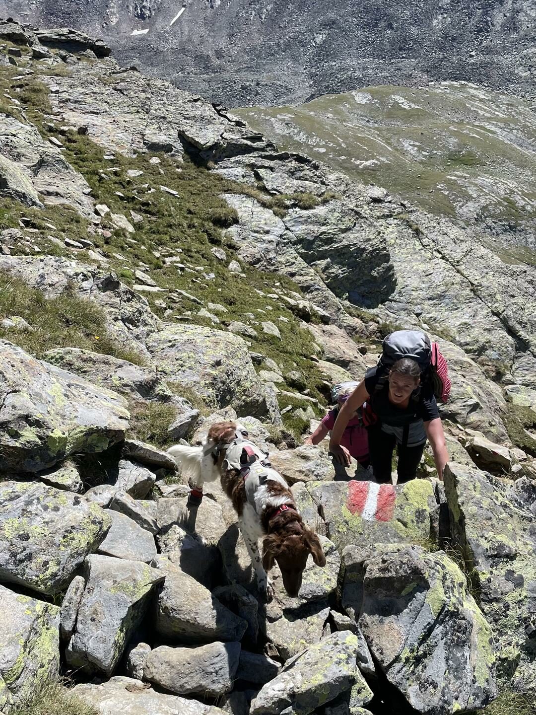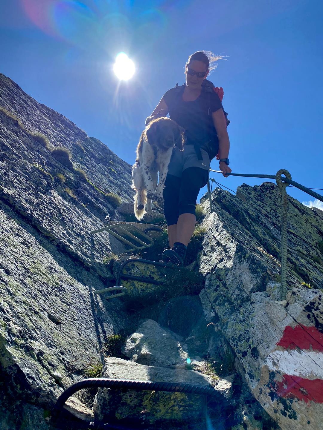 Diese Trekkingtour ist also auch für den bergerfahrenen Hund sehr anspruchsvoll. Hohe, zuweilen versicherte Steilstufen erfordern Unterstützung vom Menschen. Ein gutes Bergsteigergeschirr, aus dem der Hund nicht herausrutschen kann, sowie eine reißfeste Leine sind obligatorisch. Zudem gehören Pfotenschuhe ins Gepäck, da sich die Hornhaut an den Pfoten auf den vielen Kilometern im schroffen Gelände schnell abnutzt – für Lotte hätte es fast den Abbruch der Tour bedeutet, ihre Pfoten waren nach einigen Tagen sehr empfindlich. Ich würde sogar dazu tendieren, ein Paar mehr einzupacken. In Talnähe trifft man auch auf Kuhweiden. Für schwere Hunde könnte diese Hüttentour gegebenenfalls zum Problem werden, da sie nicht so gut unterstützt werden können. Kurzum: Die Tour ist nur etwas für kletterfreudige, absolut gehorsame Hunde mit alpiner Erfahrung.