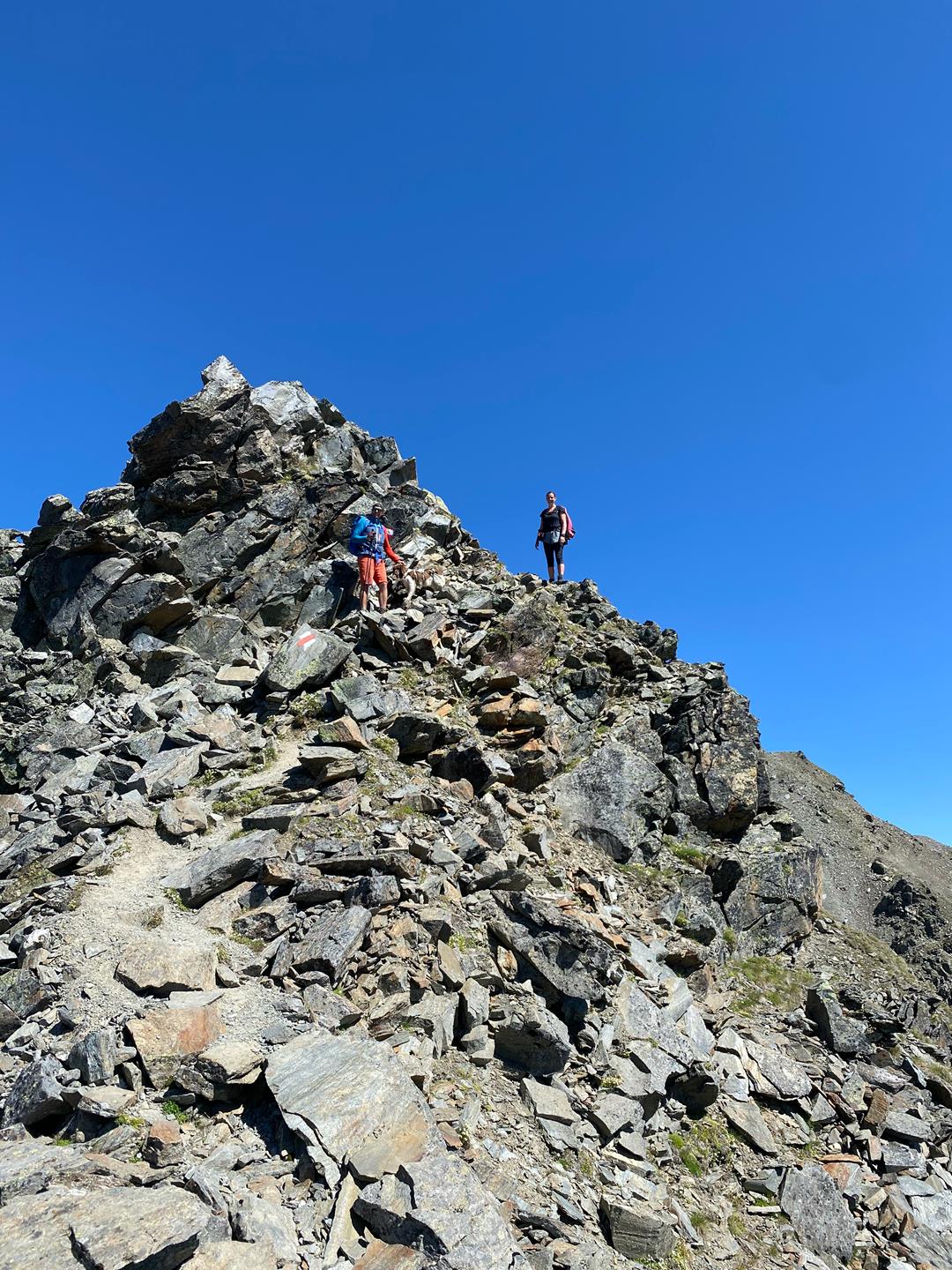 Hinweis: Die Gehzeiten sind großzügig bemessen, da wir mit Hund unterwegs waren, der an einigen Stellen und über Blockwerk die ein oder andere helfende Hand benötigte. Ich denke, dass fitte und einigermaßen akklimatisierte Bergsteiger:innen etwa 20 Prozent weniger der hier angegebenen Zeit benötigen.