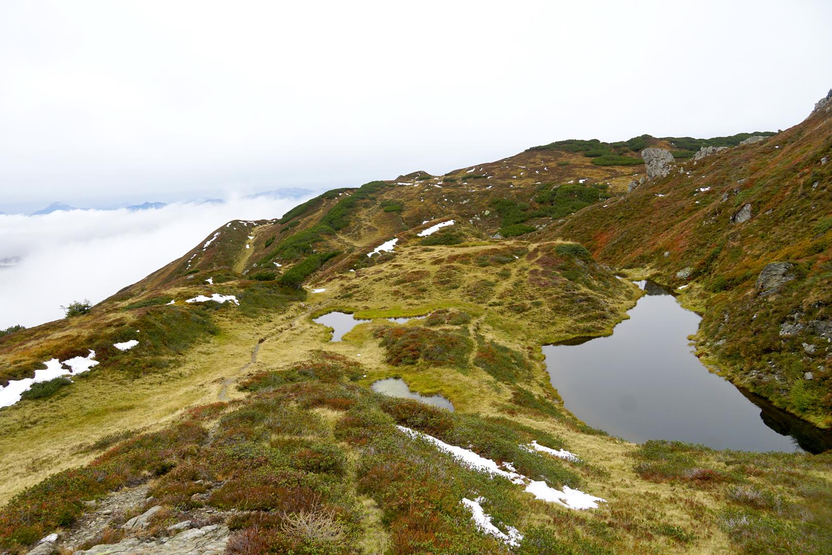 Die Aussicht muss bei gutem Wetter fantastisch sein, doch auch für uns hält diese neblige Stimmung mit den bunten Herbstfarben einige schöne Momente bereit. Auf dem sich anschließenden Panoramaweg können wir uns an einer äußerst vielseitigen Natur erfreuen: Latschnkiefern, Hochmoore mit kleinen Moorlaken und Alpenrosen sowie Beerensträucher säumen das Gebiet, während uns die Bergketten der Kitzbüheler Alpen einrahmen. Wir erreichen schließlich den höchsten Punkt der Tour vor, das Gerstinger Joch (3), 2035 m. Die Aussicht vom Gipfel ist fantastisch, vor allem der markante Große Rettenstein beeindruckt bei der Gipfelschau. Bei hervorragender Sicht mag man sogar den Großglockner ausmachen.