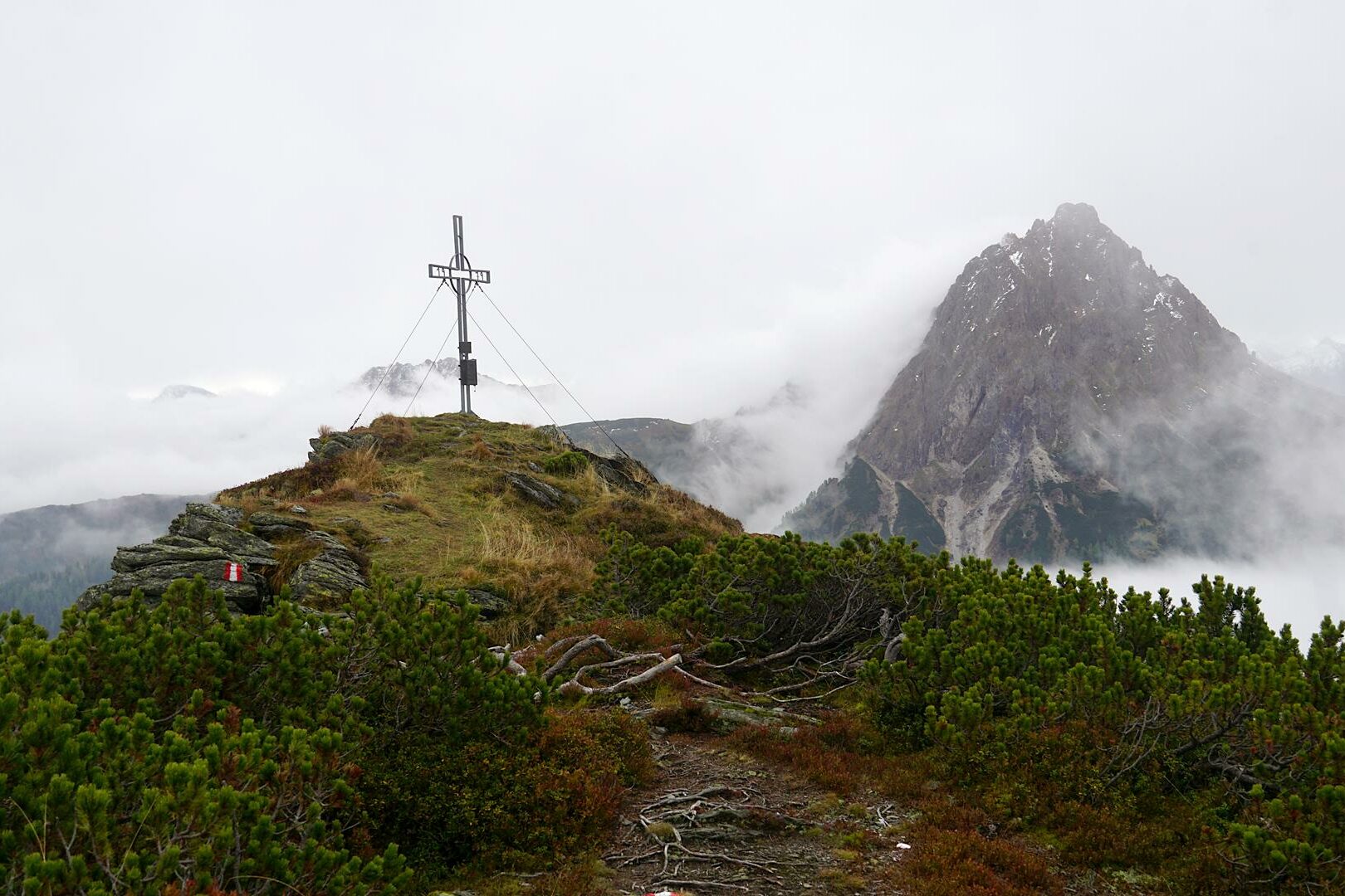 Dieser bringt uns zu einem Joch, hinter dem wir dann noch ein Stück hinauf gehen, um den Gipfel des Lodron (2), 1925 m, zu erreichen. Auch wenn sich für mich in Sachen Sicht kaum etwas ändert, markiert der Gipfel mit dem imposante Gipfelkreuz normalerweise einen tollen Aussichtspunkt. Bei gutem Wetter soll die Sicht bis in die Hohen Tauern reichen und hinüber zum markanten Wilden Kaiser.