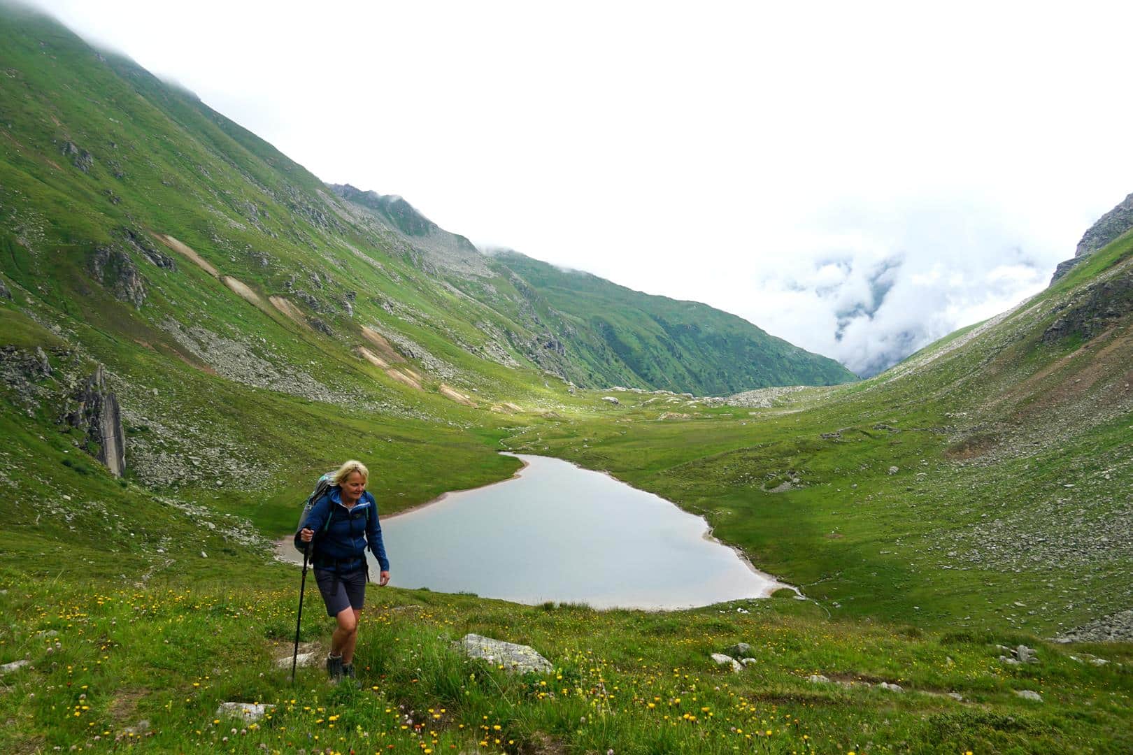 Nach kurzer Stärkung wandern wir am linken Ufer auf einem schönen Höhenweg am Unteren Bockhartsee (3) vorbei und gelangen einen kleinen Anstieg später zum Oberen Bockhartsee (4). Spätestens bei letzterem verschwinden auch die letzten Tagesgäste und wir dürfen ganz allein diese weite Graslandschaft, durch die Wolkenfetzen ziehen, genießen. Die Wege sind einfach, etwas stufig und auch gut beschildert. Kurz danach erreichen wir die Bockhartseescharte (5), rechts daneben, keine 40 Höhenmeter über uns, lockt der gleichnamige Gipfel. Wir lassen unser Gepäck an der Scharte und nutzen das kleine Wolkenloch, um rasch hinaufzusteigen. Am Bockhart (6), 2260 m, haben wir eine schöne Sicht.