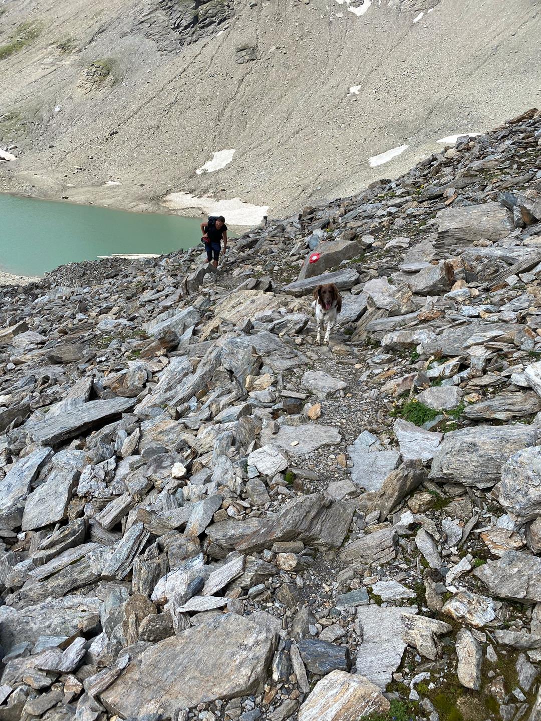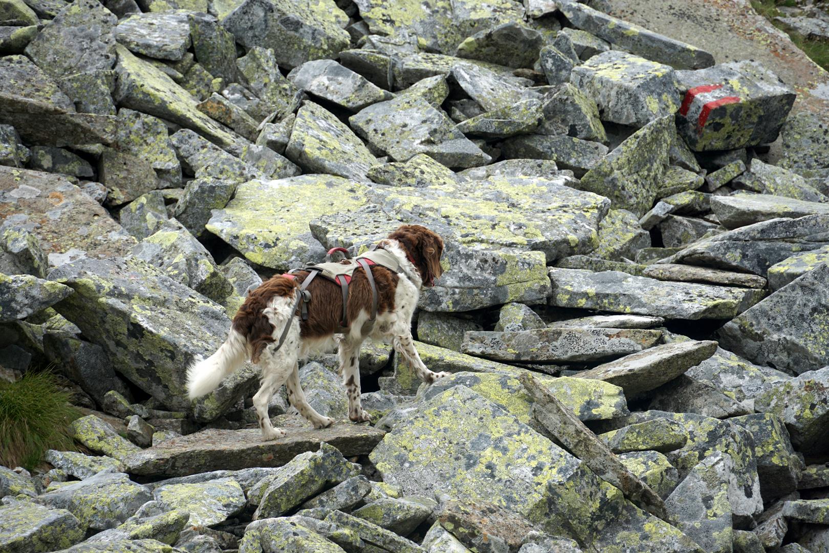 Mit unserer 13-jährigen Hundeseniorin Lotte war diese Tour kein Problem, auch wenn sie vor allem auf der zweiten Etappen und hin und wieder durch das Blockwerk Unterstützung brauchte. Die fällt bei einem jüngeren Hund vermutlich geringer aus, allerdings sollte der Hund in Sachen Gehorsam eine „Eins“ auf dem Zeugnis stehen haben. Denn was für den Wanderer in Sachen Steinschlag- und Absturzgefahr gilt, gilt auch den Hund. Er sollte wohlerzogen auf die Befehle hören, nicht toben und tollen und sich problemlos Heben lassen. Auch konditionell wird dem Hund einiges abverlangt.