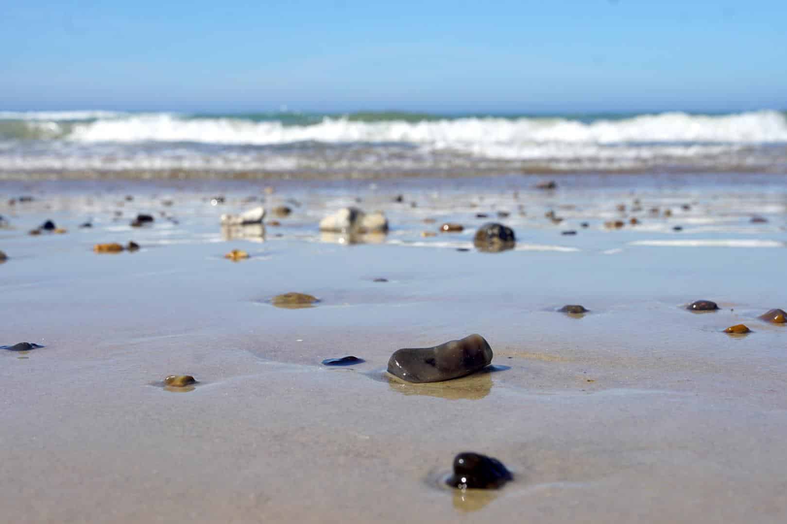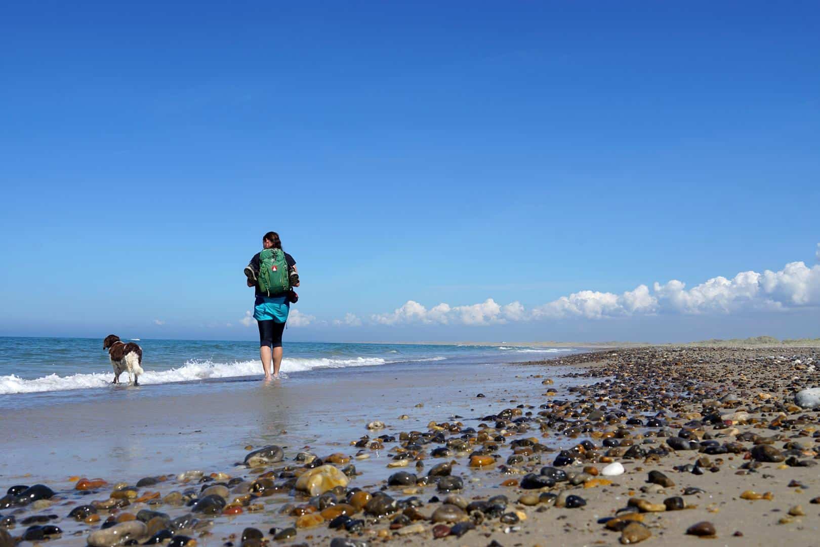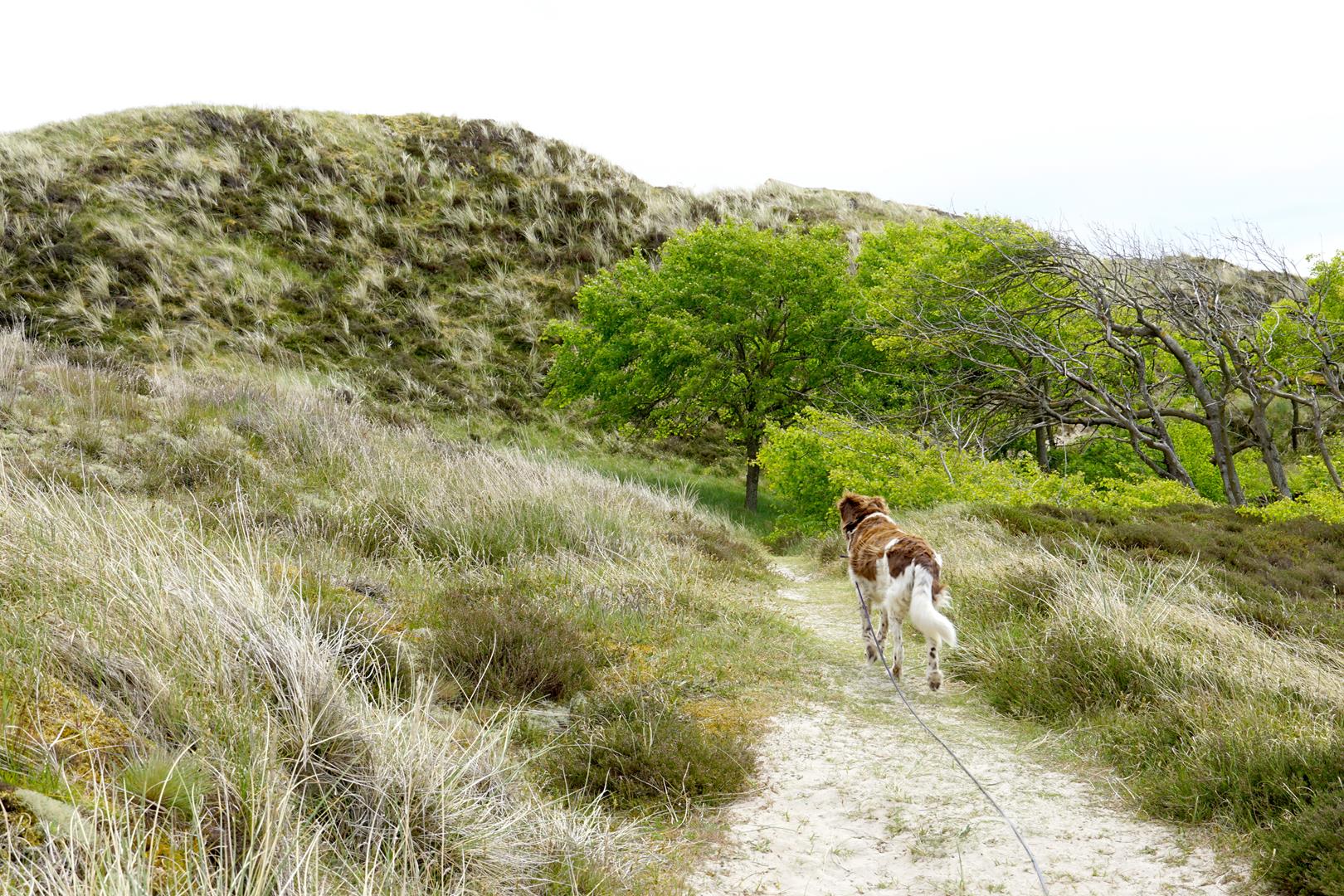 Als ich einige Teilstrecken des Nordseewanderweges mit Lotte getestet habe, haben mich zwischenzeitlich tatsächlich 17 (!) Stunden Sonne und ein immer blauer Himmel erwartet. Das sind natürlich die besten Voraussetzungen, um heiß gelaufene Füße und Pfoten in der kühlen Nordsee zur kühlen und viele Kilometer barfuß am Strand zu wandern. Die kleinen Pfade, Aussichten von Bergen (ergo Dünen) die hübschen bunten Fischerboote, die direkt am Strand anlanden, haben mich schlicht begeistert. Lange Strandpassagen lockerte ich mit dem Sammeln schöner Muscheln und Steine auf und ließ mich dabei von Möwen auslachen – so läuft man Kilometer für Kilometer, ohne es zu merken. Und wenn der Weg doch einmal ins Landesinnere führt, bringt er uns auf wilden Wiesenpfaden zu hügliger Dünenlandschaft. Kurzum: Ein Fernwanderweg, der alle Vorzüge des flachen Landes vereint.