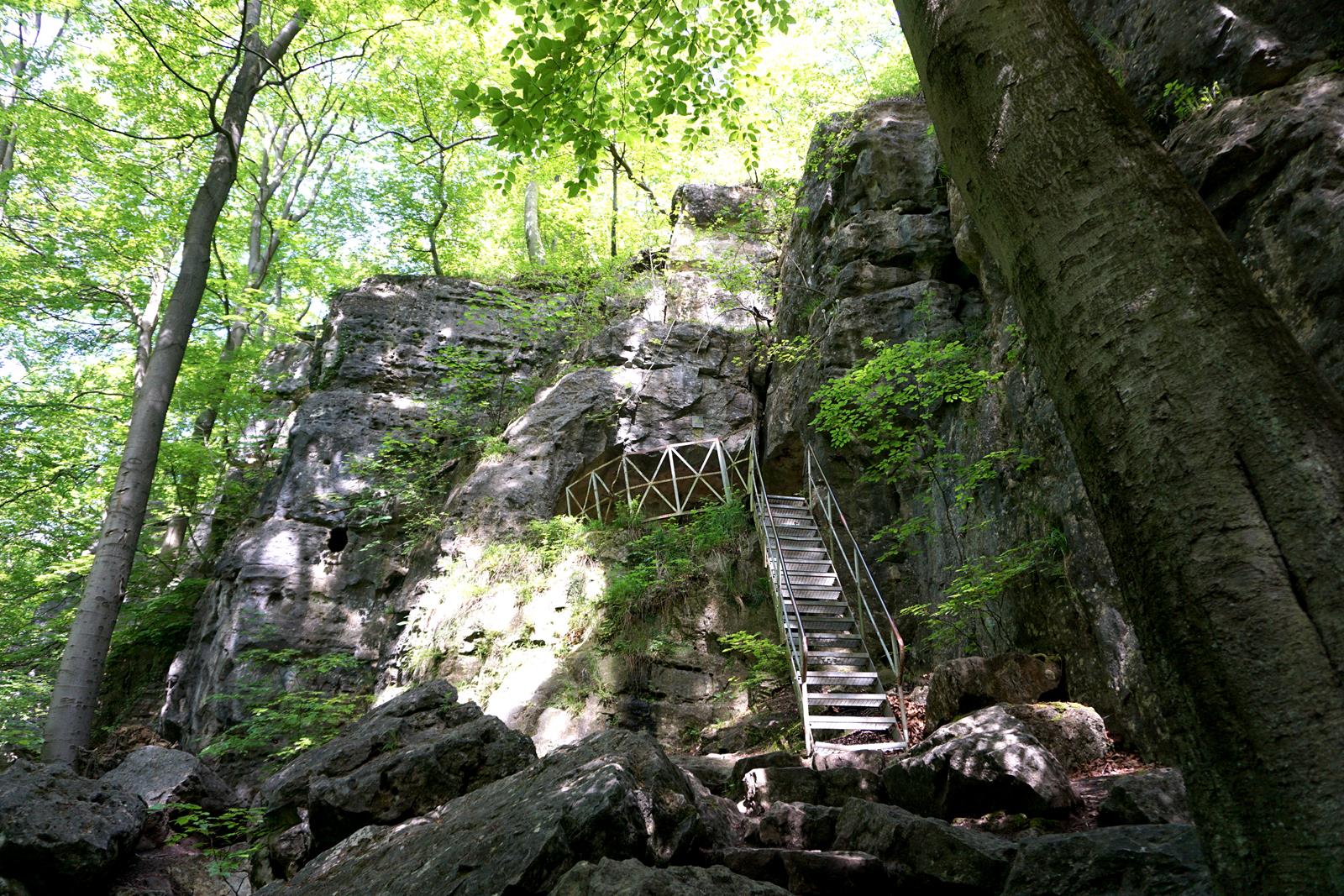 Die nächsten Kilometer führen mich tiefer in den Wald. Hin und wieder auch ein bisschen heraus, so dass ich erhaben auf kleine Dörfer blicke. Ein Stück Kiefernwald, dann bin ich zurück im Buchenwald. Das frische Laub ist so grün, dass es zuweilen in den Augen wehtut. Kurz vor unserem Etappenziel erreichen wir an einem rauschenden Fluss die Lippoldshöhle (5). Die Sage dazu besagt, dass ein Räuber namens Lippold mit schrecklichen Taten die Menschen im Umland in Atem hielt. Seine einstige Wohnung, die Lippoldshöhle, lässt sich mit Taschenlampe besichtigen.
