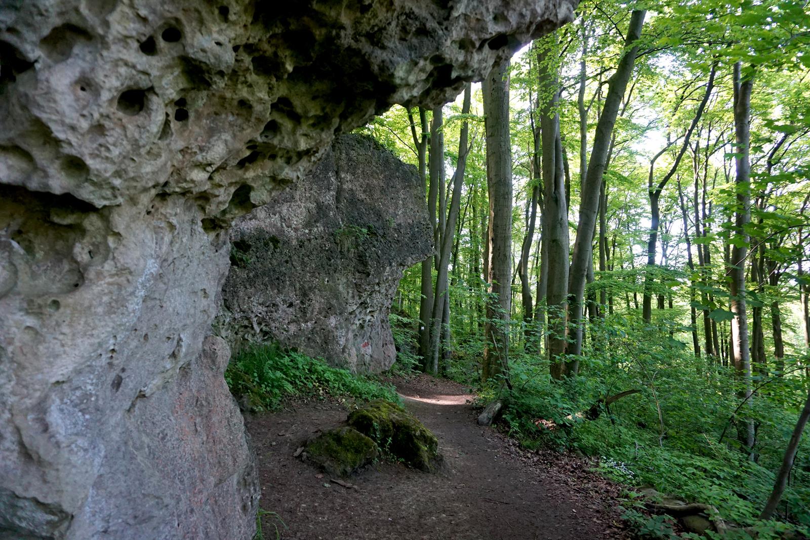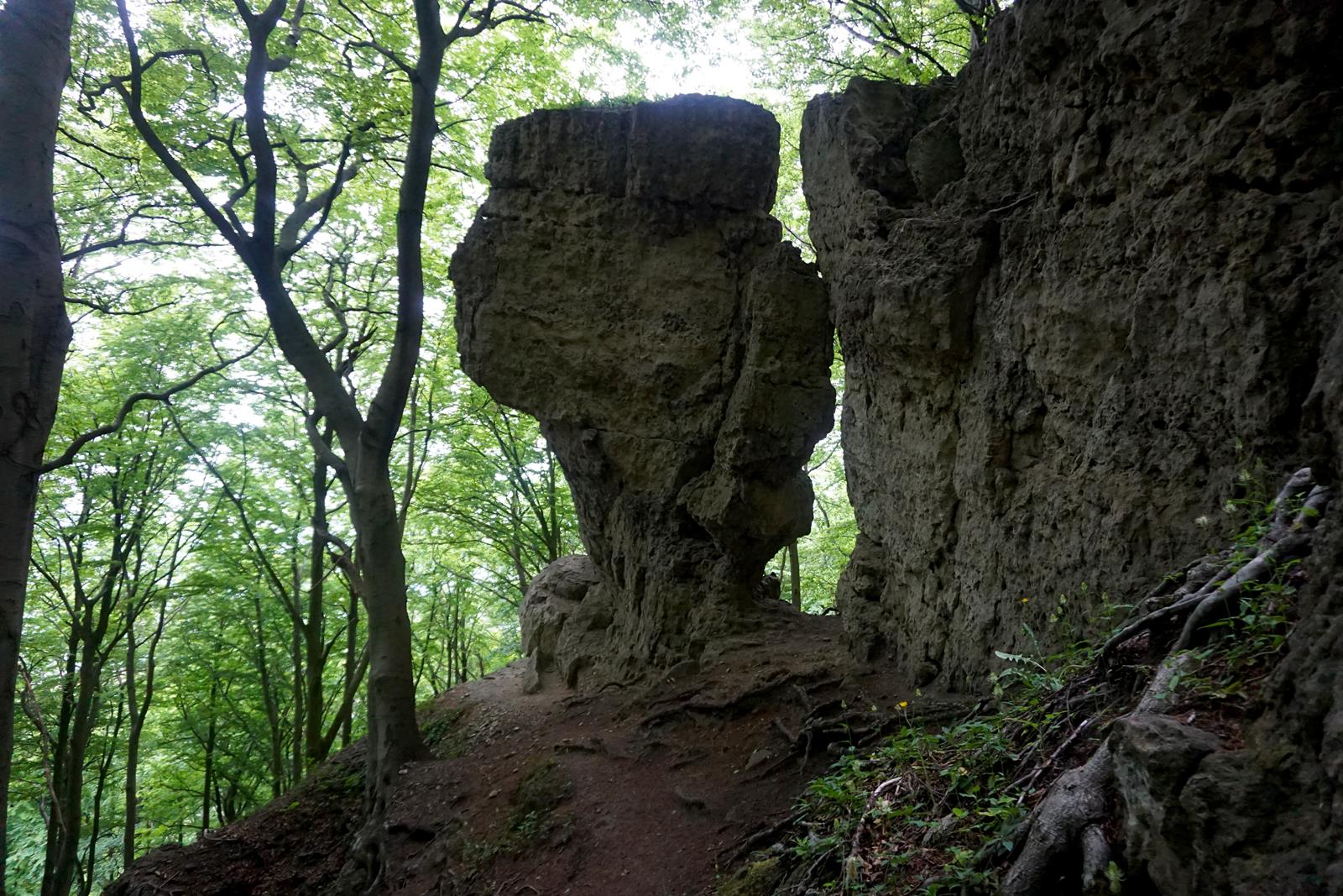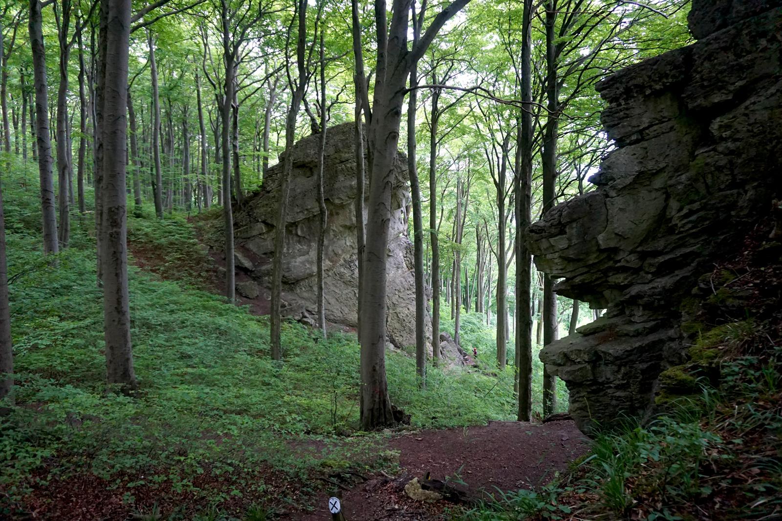 Am Kanstein selbst reihen sich bis zu 20 m hohe Kalksteinklippen aneinander, die wir auf unserem Weiterweg passieren. Mitten im Wald liegen große Gesteinsbrocken, wir erklimmen die ein oder andere Klippe für eine bessere Aussicht und steigen nach und nach wieder vom Thüster Berg ab. Die vielen Spalten der Klippen dienen übrigens Fledermäusen als Quartiere und auch die Wildkatze ist hier wieder heimisch. Irgendwie ist die Welt hier noch in Ordnung.