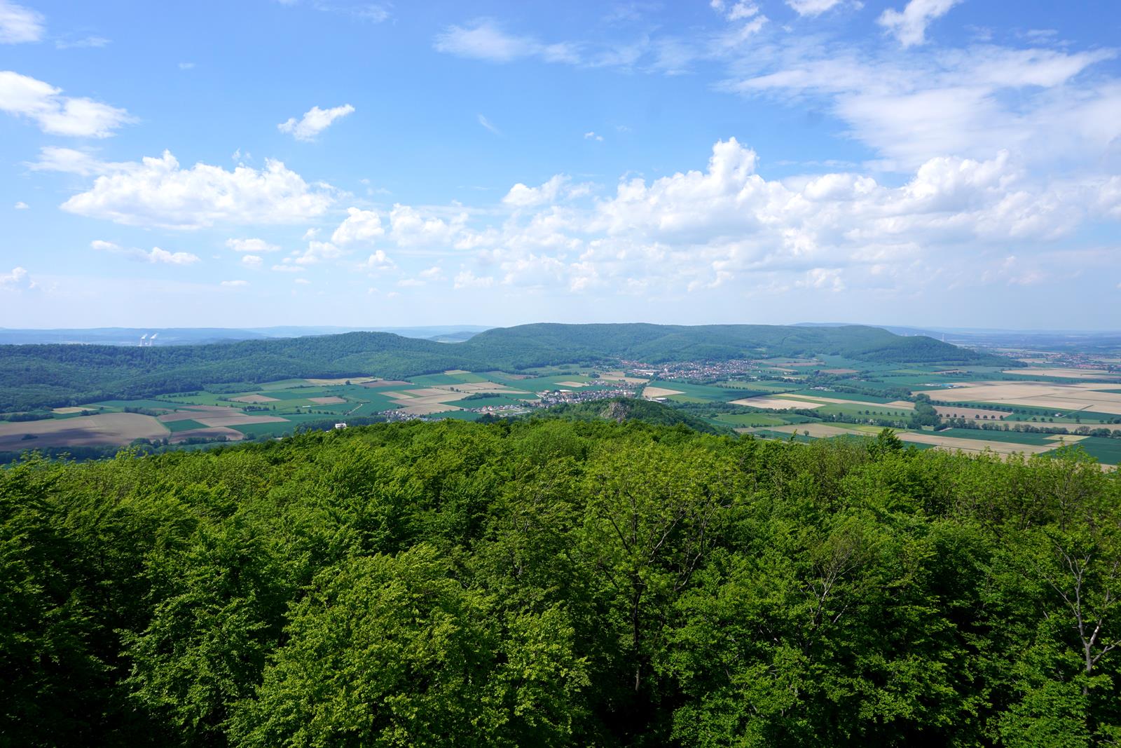 Dann geht’s erst mal bergab. Also nur mit dem Weg, denn wir sind richtig gut drauf. In Marienhagen (3) haben wir den Duinger Berg schließlich hinter uns gelassen und den nächsten Höhenzug vor der Brust. Den Thüster Berg. Seine höchste Erhebung, der Kanstein mit 441m soll unser höchster Punkt an diesem Tag werden. Schön schattig führt uns der Ith-Hils-Weg durch alte Buchenwälder. Das ist ein Genuss und wirklich beeindruckend, wenn die Baumriesen bis zu 30 Meter neben einem aufragen. Aber es ist trotzdem sehr warm, so dass wir uns am Lönsturm (4), der auf dem Kanstein steht, erst einmal eine extralange Pause gönnen.