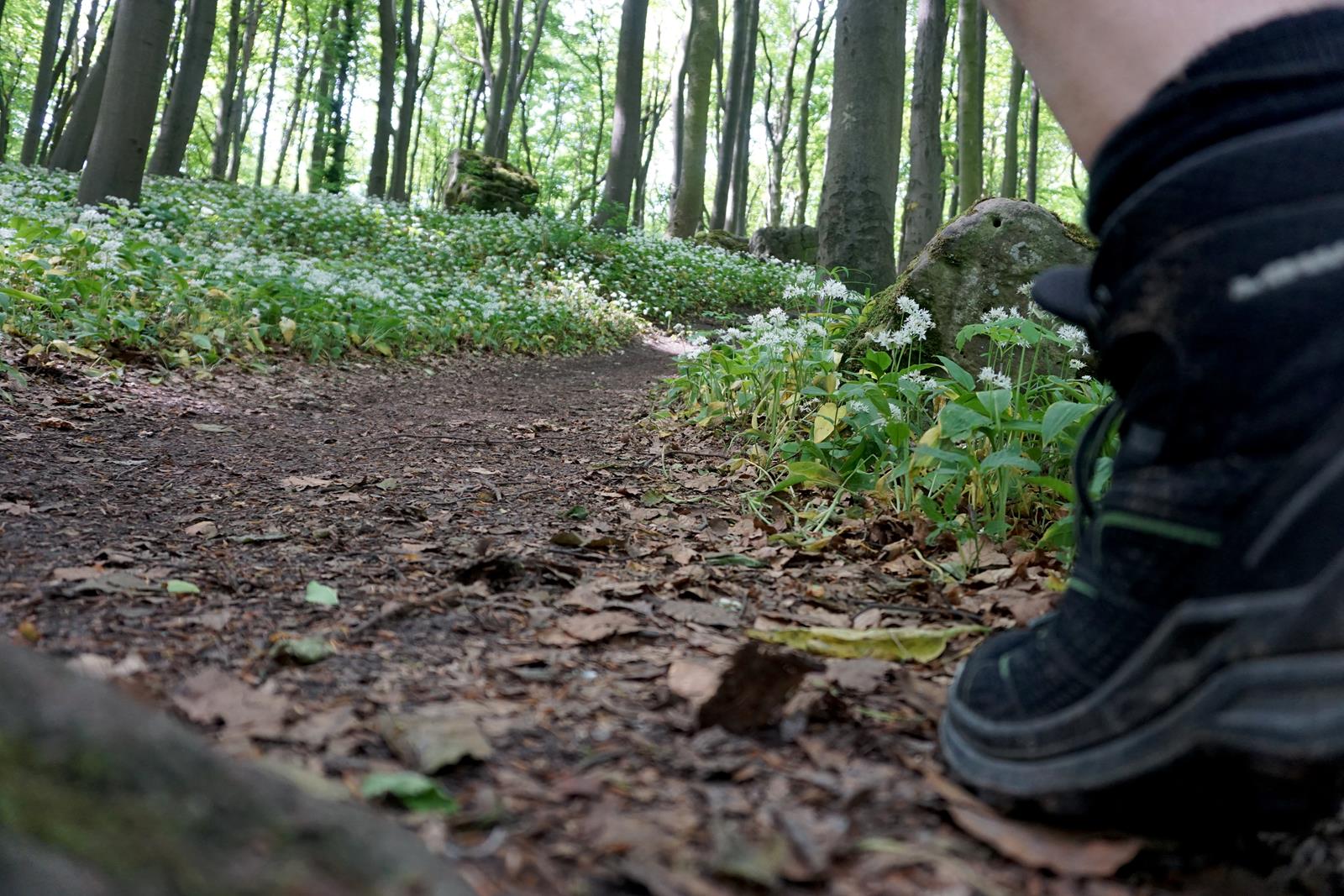 Perfektion ist, wenn ein Weitwanderweg am letzten Tag noch einmal alles gibt. So auch auf unserer Schlussetappe auf dem Ith-Hils-Weg. Allein der inoffizielle Name, den ich dieser Etappe gegeben habe, sagt eigentlich schon jede Menge aus: Ith-Durchquerung der Länge nach. Vom Naturfreundehaus Lauenstein (1) führt uns der Weg erst einmal bis an den Ortsrand von Coppenbrügge. Ein paar Wiesen, ein paar Waldwege und wenige Kilometer später geht’s erst einmal hinauf auf den Ith. Der Aufstieg ist ein Traum! Ein steiler, stufiger Weg führt vorbei an den ersten Klippen hinauf ins Paradies. Den übrigen Weg des Tages darf man getrost als Bärlauch-Pfad bezeichnen. Der ganze Wald duftet danach und die riesigen Felder stehen in voller Blüte. Ich bin wirklich sprachlos, so schön ist das anzuschauen.