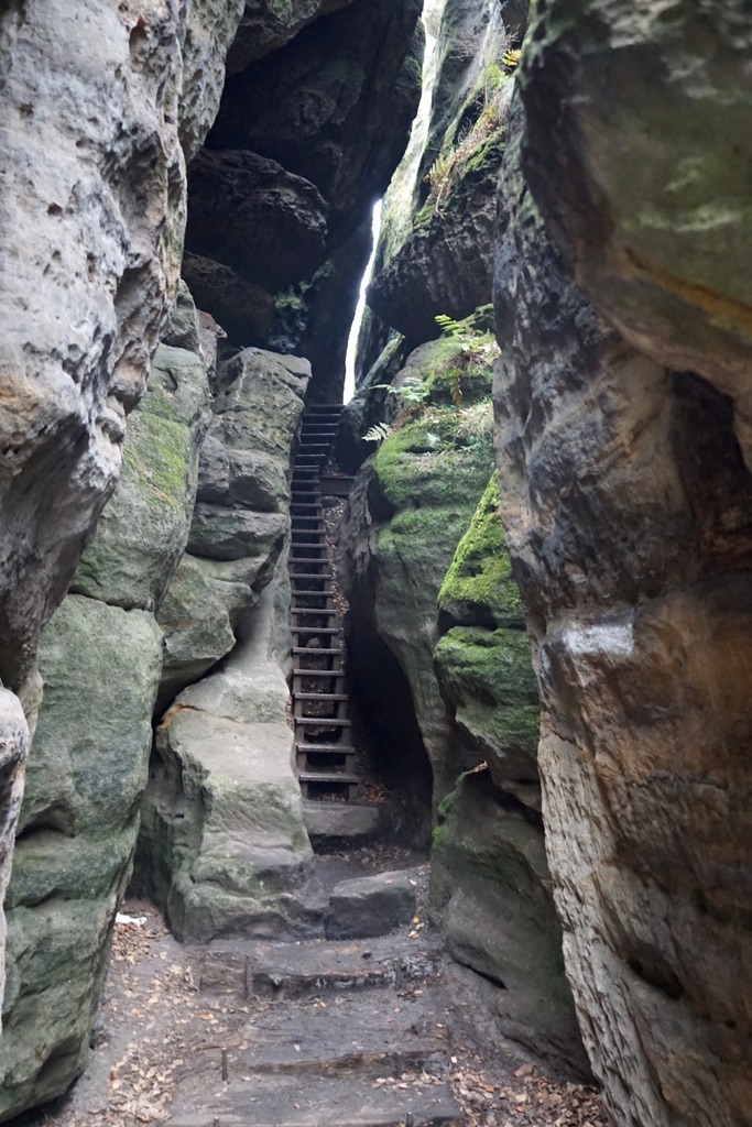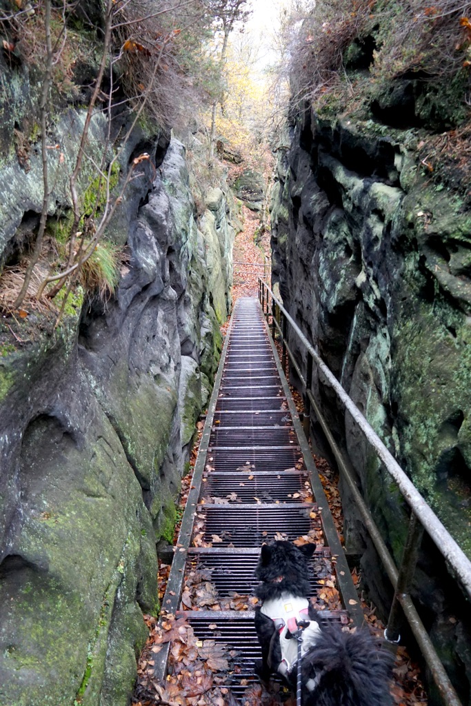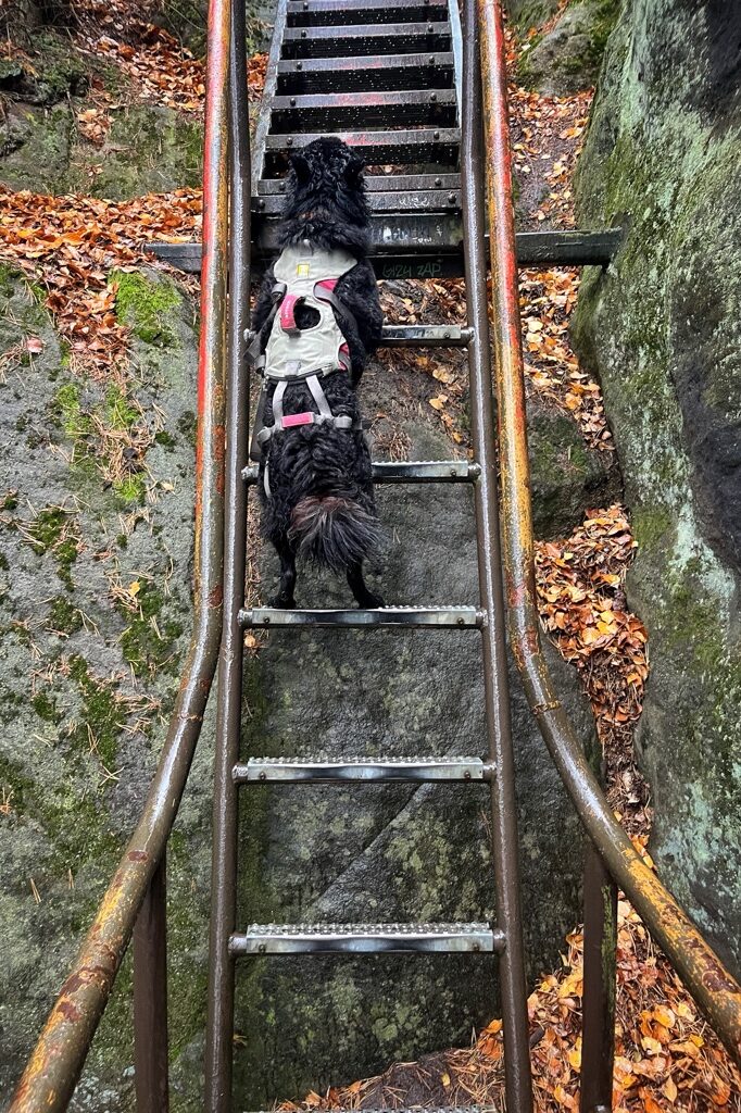 Über den schmalen Jägersteig mit seinen Eisenleitern geht es hinauf auf einen Gratweg, von dem sich atemberaubende Blicke über die zerklüftete Felsenwelt eröffnen. Die mächtigen Sandsteinfelsen beeindrucken – vielleicht sogar noch mehr, wenn sich ihre massiven Konturen geheimnisvoll aus dem Dunst erheben. Der Pfad windet sich an steilen Felswänden entlang, führt durch enge Spalten hindurch und erfordert an manchen Stellen sogar den Einsatz der Hände – ein Abschnitt mit echtem Spaßfaktor. Kein Weg, den ich kenne, wäre bei Regen so schön. Abenteuerhund Greta stört sich daran eh nicht, sie fliegt über Gitterroste, mit Vollspeed die Treppen hinauf und einmal, als ich nicht hinschaute probierte sie eigenständig eine lange senkrechte Leiter hinaufzukommen. So was Mutiges! Die Kleine hat’s drauf.