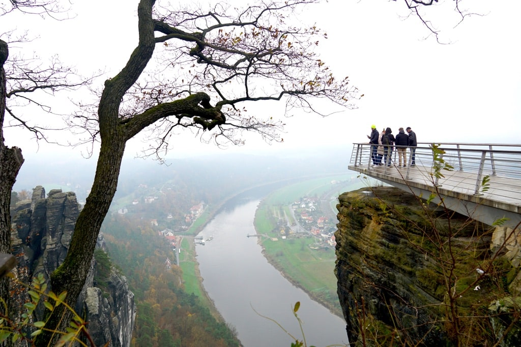 Über den Wehlener Grund führt die Route weiter zur Stadt Wehlen (3), eine niedliche Ortschaft von der es zunächst gemütlich am Elbufer entlanggeht, bevor der Weg steil zum Schwarzberg ansteigt. Die Mühe lohnt sich: Oben angekommen, eröffnet sich ein atemberaubender Blick über das Elbtal. Kurz darauf lädt die Waldgaststätte Steinerner Tisch zur Einkehr ein, bevor wir eines der absoluten Highlights des Malerwegs erreichen: die Bastei mit der berühmten Basteibrücke (4). Diese beeindruckende Felsformation zählt zu den bekanntesten Sehenswürdigkeiten der Sächsischen Schweiz. Der Ausblick von der Basteibrücke über das Elbtal, die umliegenden Tafelberge und die zerklüftete Felsenlandschaft ist schlicht atemberaubend.