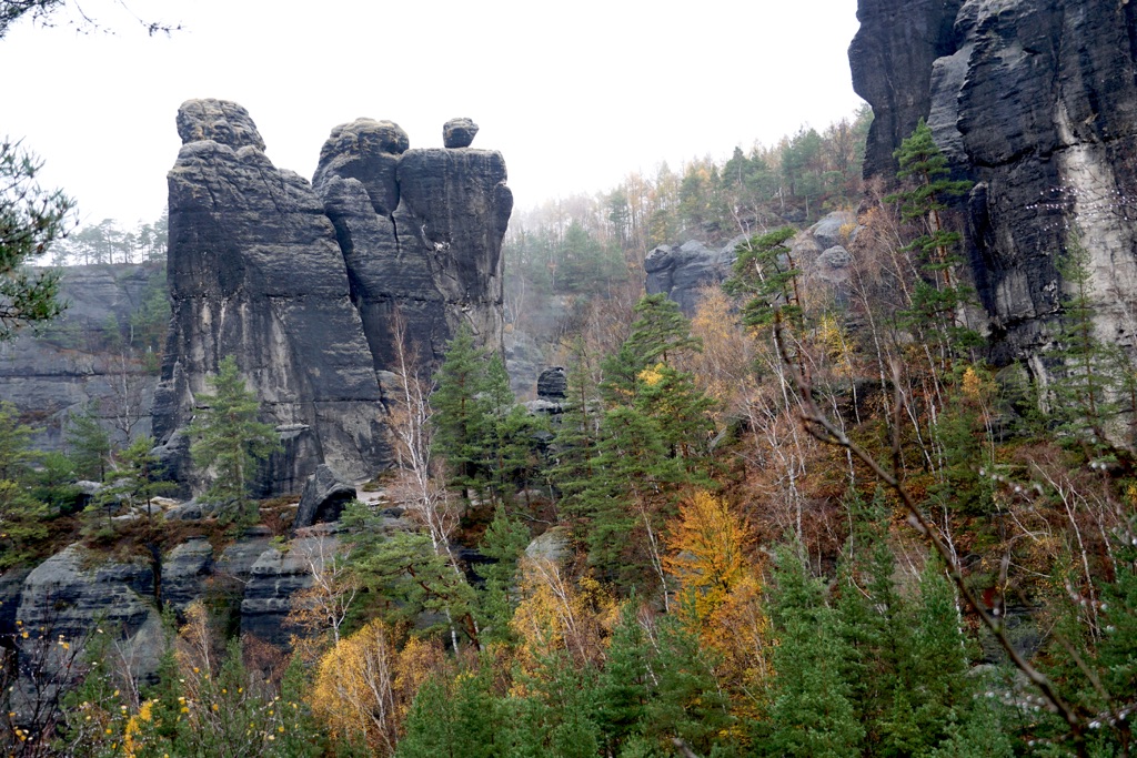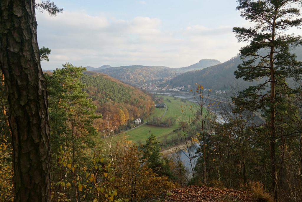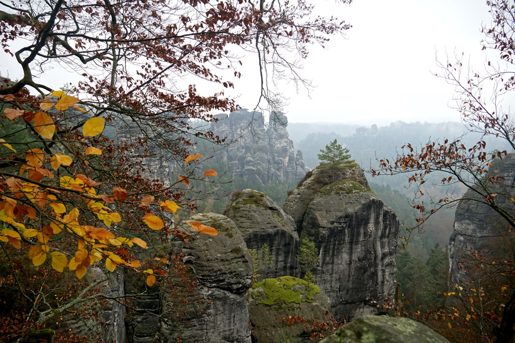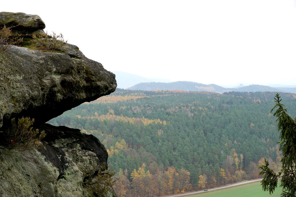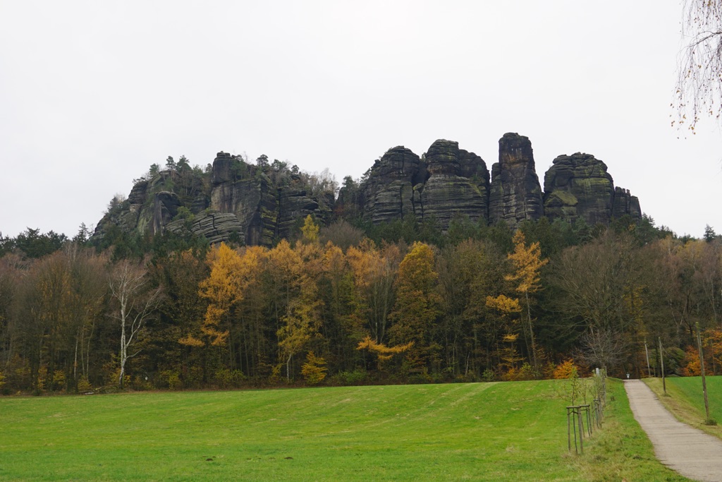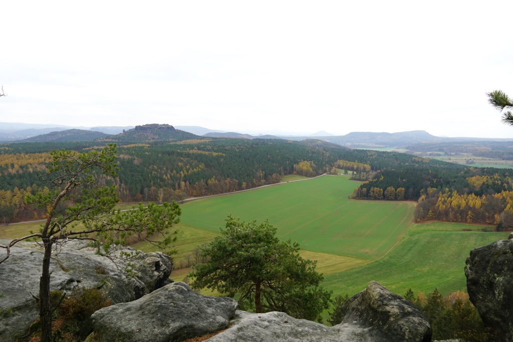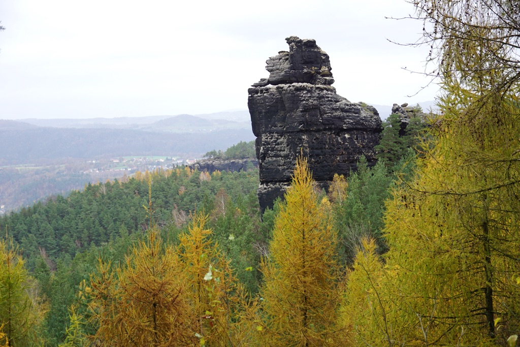 Womöglich kam heute für etwa 60 Sekunden auch mal kurz die Sonne raus. Aber trotz Wolken, hatte ich an diesem Tag endlich mal etwas Weitsicht. Hat mir gut gefallen. Die Sichten waren zwar durch viele, viele Stufen hart erarbeitet, aber diese Sandsteinfelsen sind schon besonders. Und mit diesen vielen goldgelben Lärchen, dem letzten Herbstlaub und dem grünen Moos, sah das wirklich schön aus. Die letzte Etappe des Malerwegs beginnt im Kurort Gohrisch (23) und führt zunächst ein Stück zurück auf dem Weg des Vortags.