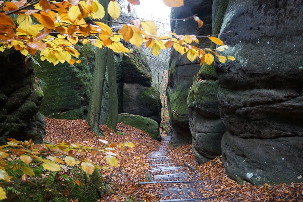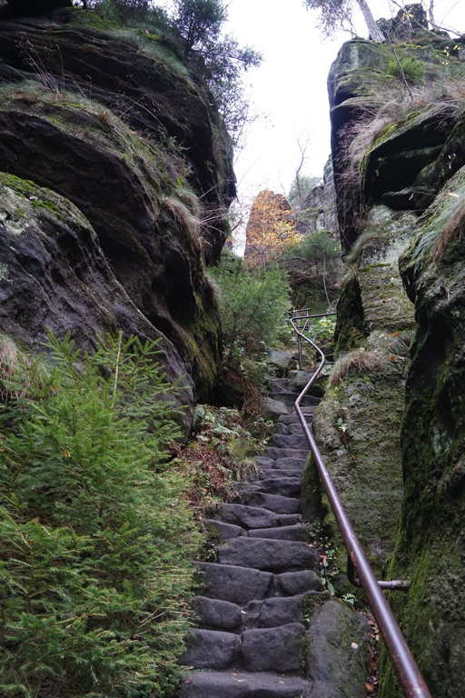 - Etappe 1: Hier können metallene Treppen, die durch die enge, dunkle Wolfsschlucht führen, problematisch sein. Den steilen Abstieg über Eisentreppen kann man über den Lehrpfad nach Hohnstein umgehen.