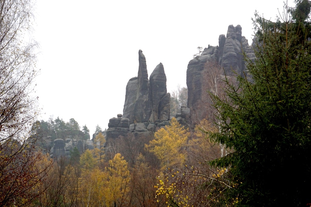 Natürlich! Auch heute schien die Sonne nicht. Dafür gab’s statt der angekündigten Stunde Regen, wenigstens den ganzen Tag Nass von oben. Bei 2 Grad. Da kann man nicht mal ne Pause machen. Aber das war überhaupt nicht schlimm. Dafür nämlich hatte ich alles fast ganz allein für mich – selbst die legendären Schrammsteine. Von vorn: Von Bad Schandau (10) geht es zunächst zurück auf den Malerweg und weiter bis zur Ostrauer Mühle. Der erste Abschnitt verläuft noch moderat ansteigend, doch sobald sich die spektakulären Schrammsteine nähern, nimmt auch die Steigung zu. Der Aufstieg zum Schrammtor (11) markiert den Übergang in eine der eindrucksvollsten Felslandschaften der Sächsischen Schweiz.