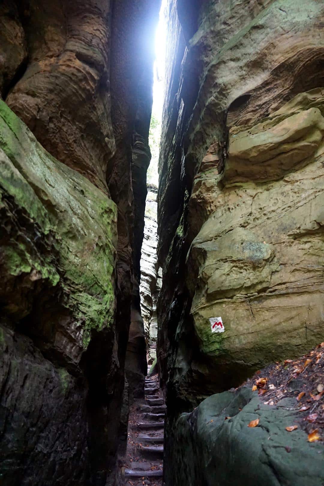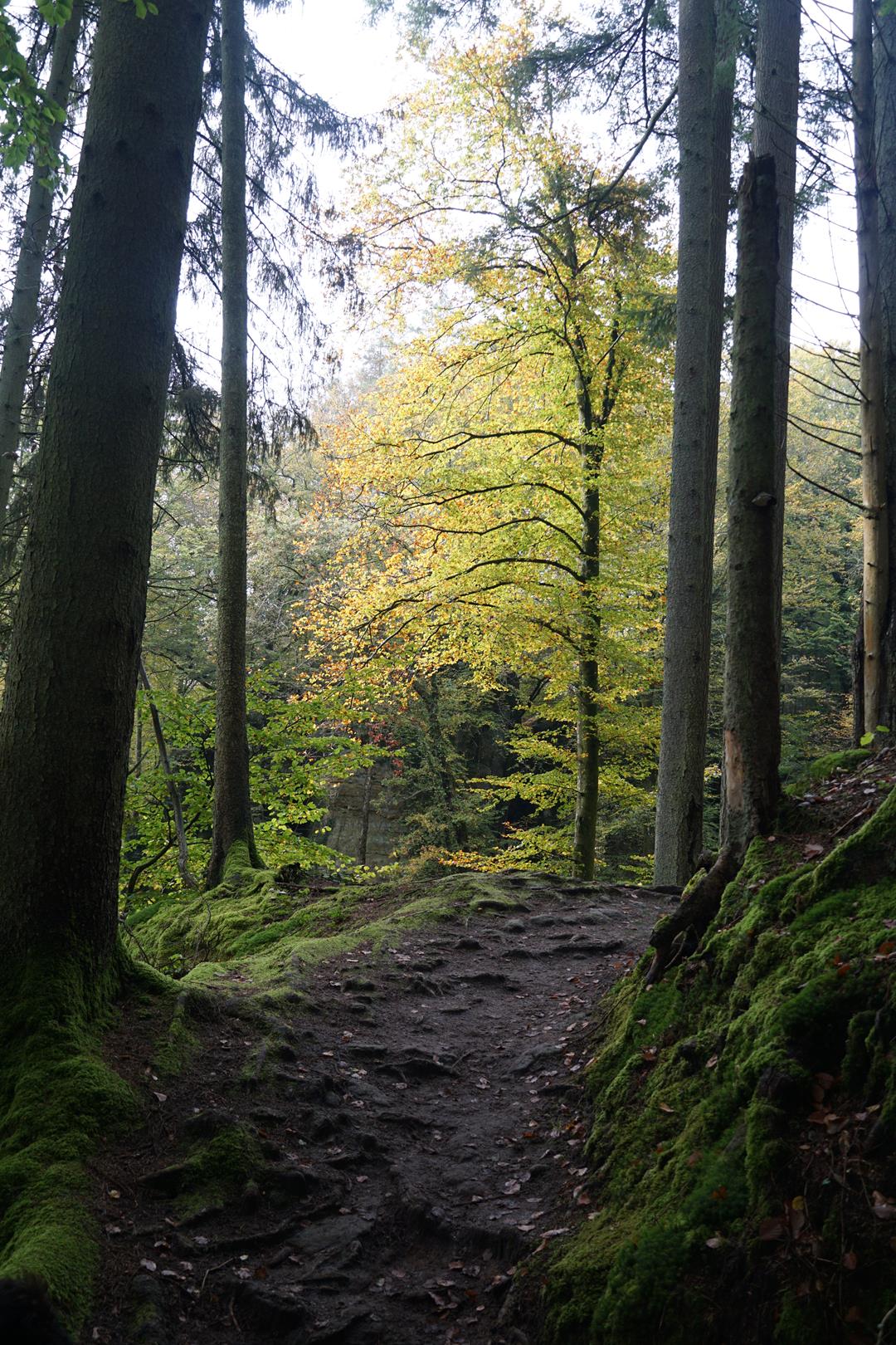 Aber auch sonst ist der Weg beeindruckend. Treppen aus Sandstein führen hinauf und durch Felsspalten, die immer wieder zu Abstechern einladen. Dann wieder dominieren herrliche Waldpfade. Die Wege sind ein Traum, die Schluchten so eng, dass ich mich so manches Mal nur mit nach vorn gestreckten Armen durchzwängen kann. Und einmal geht’s nur ohne Rucksack. Dazu kommt diese herrliche Herbststimmung mit Sonnenschein. Irgendwo steht heute immer ein riesiger Sandsteinfelsen, der bewundert werden kann.