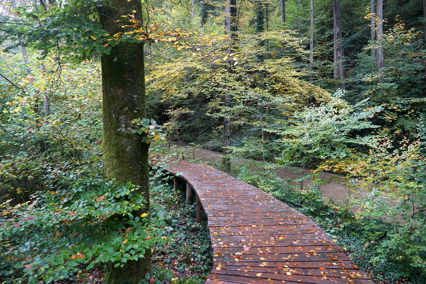 Auch an diesem letzten Tag bleibt mir der Wettergott wohlgesonnen und bei bestem Herbstwetter laufe ich die letzten Kilometer auf diesem wunderschönen Steig. Diese Etappe ist auch tatsächlich so etwas wie eine Zusammenfassung des Weges. Ich habe offene Auenland-Landschaften in denen zufriedene Kühe grasen, herrliche Herbstfarben, schöne Waldabschnitte und natürlich Felsen und jede Menge Treppen. Die ganz engen Schluchten bleiben zwar auf dieser Etappe aus, aber so wirklich störend ist das nicht.