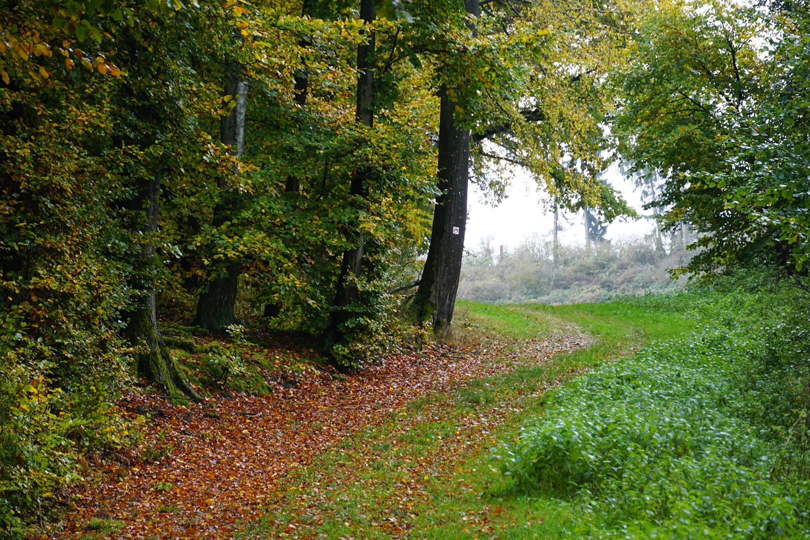 Der vorletzte Tag auf dem Trail startet in allerbester Herbststimmung im bunten Wald. Die Wege sind heute etwas ausgebauter, aber ein gesunder Wald macht ja eigentlich immer Freude. Ein Genuss für Waldliebhaber! Wir lassen heute die spektakulären Felsen hinter uns und verlassen Echternach (1) in Richtung Süden. Dann geht es lange durch offene, leicht hügelige Kulturlandschaften. Mal auf breiteren Wegen und dann wieder auf schmalen Pfaden gibt es hier nicht die ganz großen Dinge zu entdecken, dafür aber schöne Pausenplätze in einer weniger frequentierten Gegend, dem Naturwaldreservat Hierberbësch.