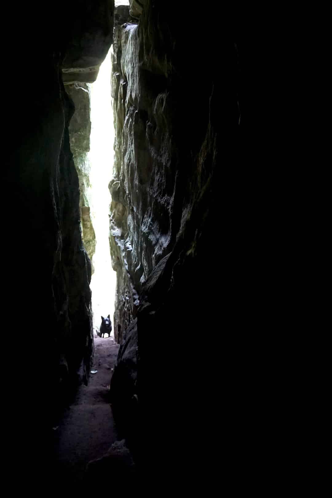 Das stete Auf und Ab, das dieser Mittelgebirgsweg zu bieten hat, ist an diesem 4. Tag so langsam auch in den Muskeln meiner Waden angekommen – vermutlich mag ich nach dem Mullerthal Trail ein paar Tage lang keine Treppen mehr gehen. Aber was nimmt man nicht für einen der spannendsten und schönsten Abschnitte auf dem Trail alles in Kauf. Von Consdorf (1) wandern wir durch eine beeindruckende Wald- und Felslandschaft und erreichen schon nach kurzer Zeit den Kuelscheier (2). Diese Felsspalte gehört zu den spektakulärsten der Region und der Mullerthal Trail führt direkt hindurch. 100 enge und sehr dunkle Meter lang ist die Spalte, eine Taschenlampe ist sinnvoll. Da ist es selbst Greta bisschen mulmig. Wem der Gruselfaktor zu hoch ist, kann auch um den Felsen herumwandern.