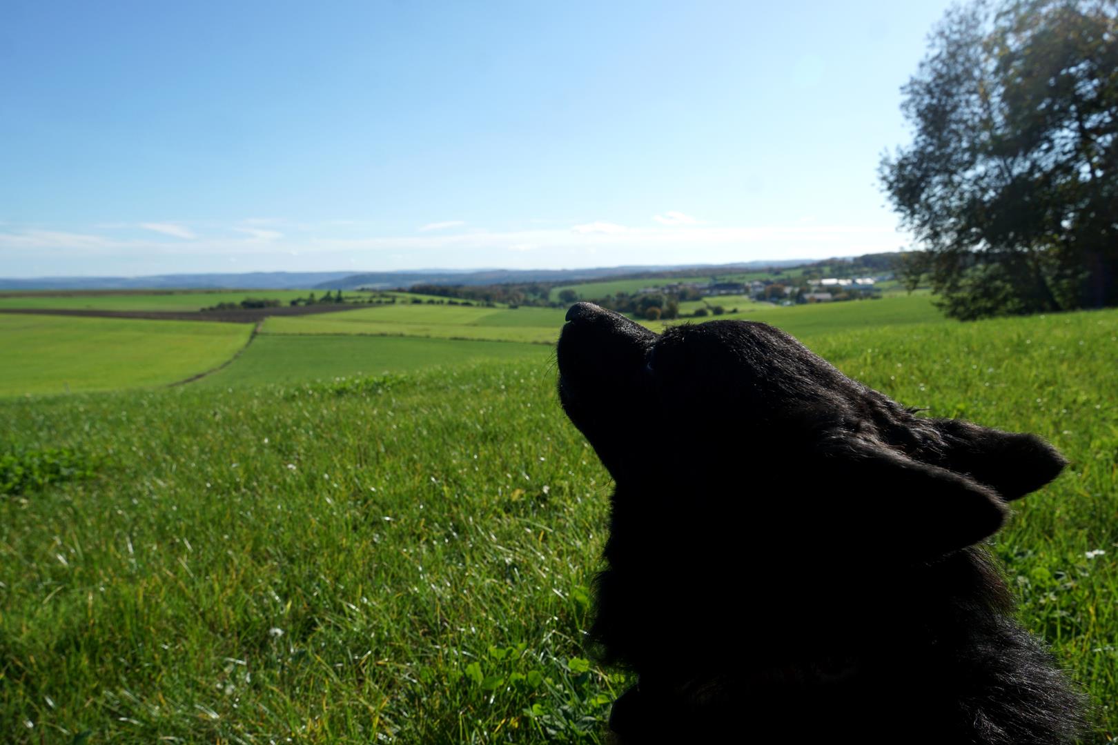 Ich kann diesen dritten Tag in vollen Zügen genießen – auch wenn mein Abenteuerhund aufgrund eines Pupertätsschubs mit gleichzeitiger Läufigkeit stimmungstechnisch eine absolute Herausforderung ist. Aber einen schönen Weg entstellt bekanntlich nichts, nicht mal ein Hund mit schlechter Laune. Erst führt mich der Mullerthal Trail durch offene Landschaften, die in herrlichen Herbstfarben leuchten. Blätter tanzen im Wind, ich habe den typischen Herbstgeruch von Pilzen und nassem Moos in der Nase und der Matsch schmatzt unter Pfoten und Wanderschuhen.