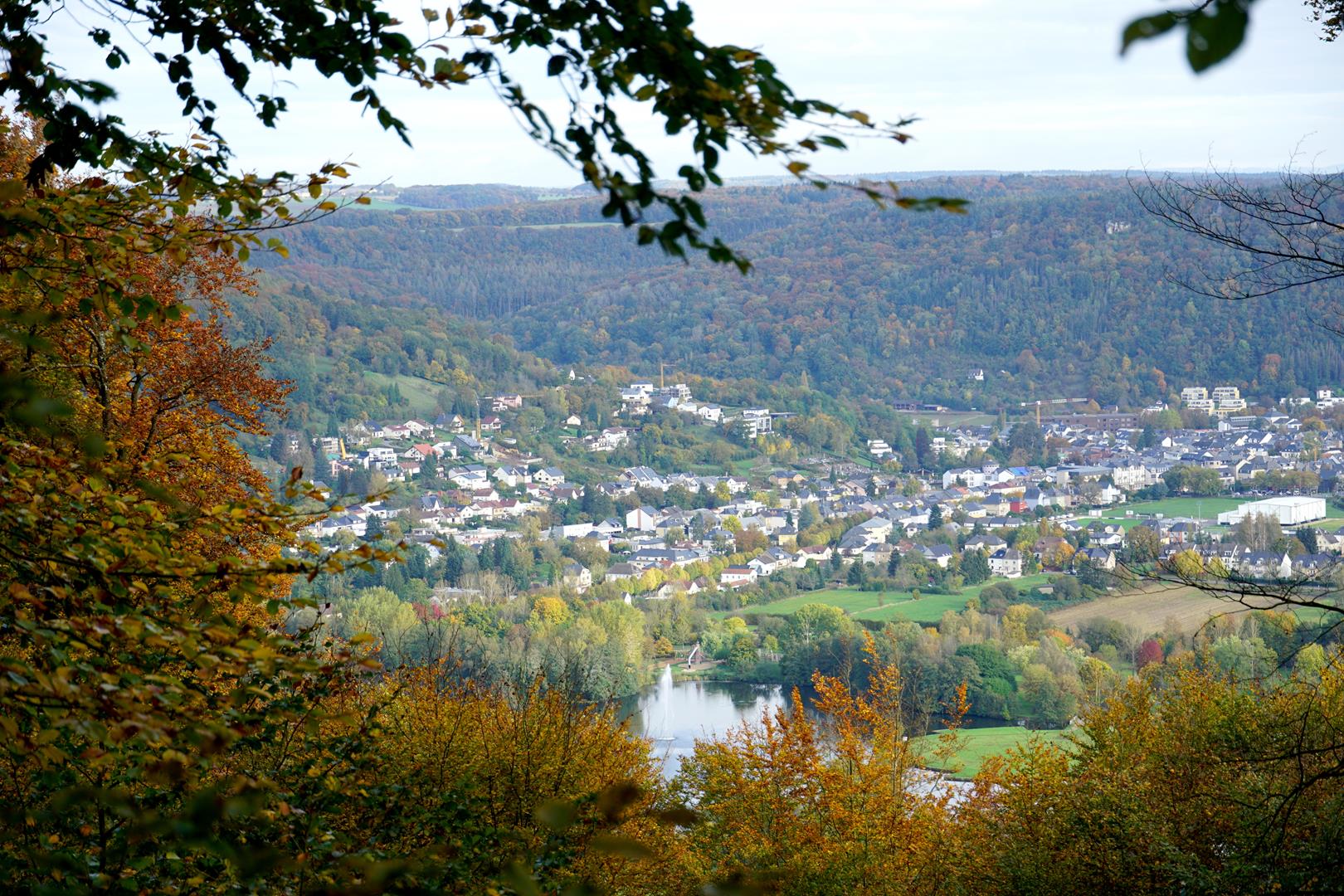 Abgesehen von einigen kleinen Ortschaften bin ich an diesem ersten Tag keinen einzigen Meter auf breiten Forstwegen oder Asphalt gewandert – das muss man als Wegplaner erst mal schaffen! Was für ein beeindruckender Auftakt auf dem Mullerthal Trail! Der Weg beginnt in Echternach (1) und führt in Richtung Berdorf. Nach einem kurzen, aber steilen Anstieg eröffnet sich am Aussichtspunkt Trooskneppchen ein schöner Blick zurück über die Stadt.