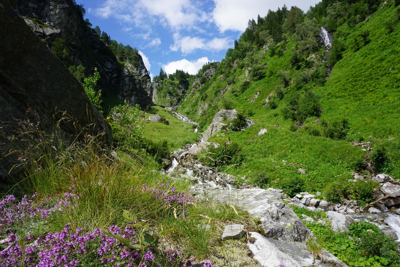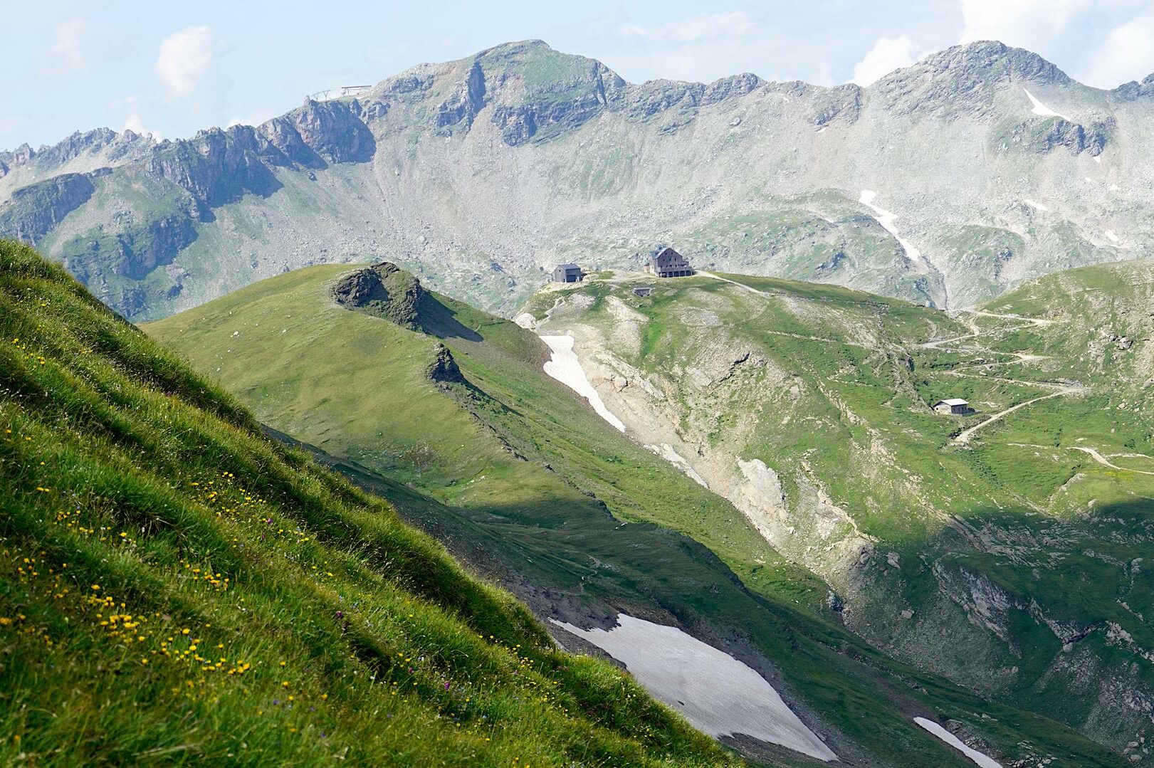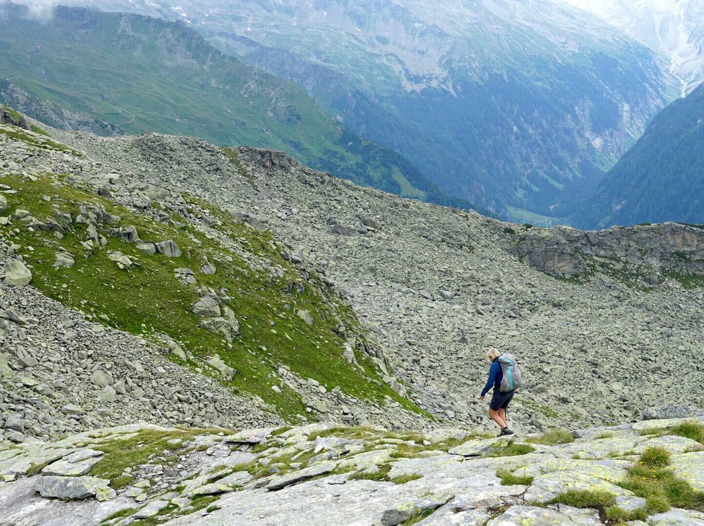 Ein herrlicher Morgen begrüßt uns an der Hagener Hütte (1) – und ein paar Schafe waren auch dabei. Wir starten auf einem wunderschönen grünen Hangweg, der die schweren Beine vom letzten Tag erst mal lockert. Doch all zulange wird es nicht so gemütlich bleiben. Wir sehen schon rasch riesige Schuttfelder vor uns liegen. Und nur ein paar Minuten später stecken wir schon mittelndrin in den riesigen Felsbrocken, die mit grünen Flechten überzogen sind. Es erinnert mich tatsächlich ein wenig an den Adamello aus dem letzten Jahr mit einem Unterschied: Hier haben sich die Wegmacher sehr viel Mühe gemacht und häufig führt ein Weg aus säuberlich angeordneten Platten durch die Felsen. Das ist schon ziemlich komfortabel.
