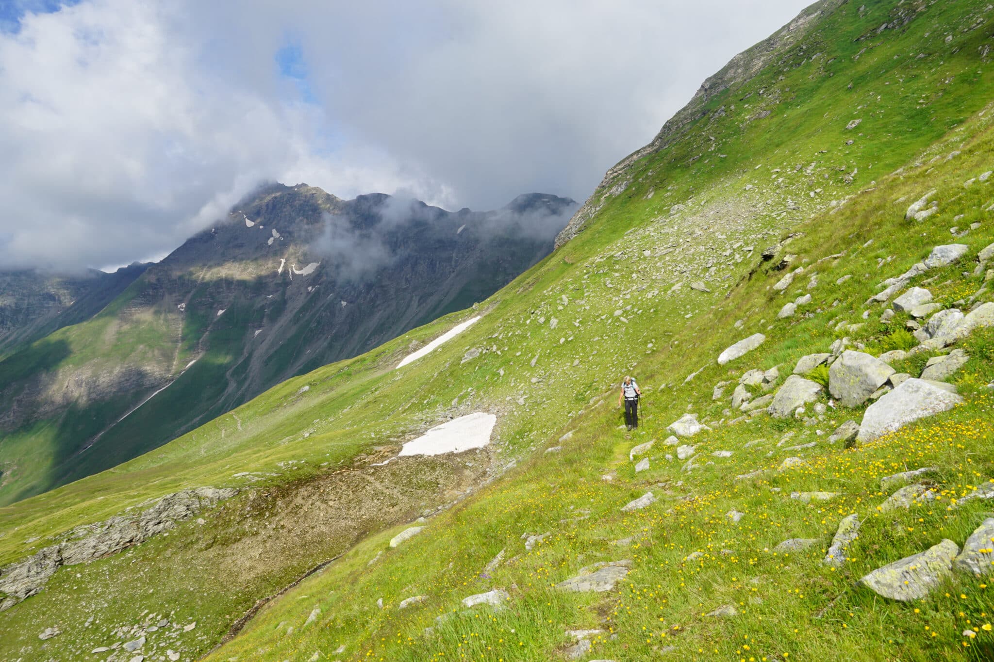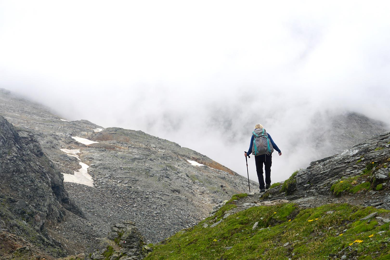 Mitnichten handelt es sich beim Tauernhöhenweg um einen gemütlichen Wanderweg. Vielmehr ist es ein anspruchsvoller Bergwanderweg, nicht selten hochalpin und auch mit versicherten Steigen. Es geht über Stock und noch vielmehr über Steine. Das verblockte Gelände, steile Schrofen, unangenehm steile Schneefelder, Steinschlag- und Abrutschgefahr – das alles ist bei Nässe lebensgefährlich. Das Herunterspielen der Gefahren ebenso, daher an dieser Stelle mein mahnender Apell, sich vom „Höhenweg“ nicht täuschen zu lassen, sondern stattdessen die alpinen Gefahren korrekt einschätzen, ohne sie zu dramatisieren.