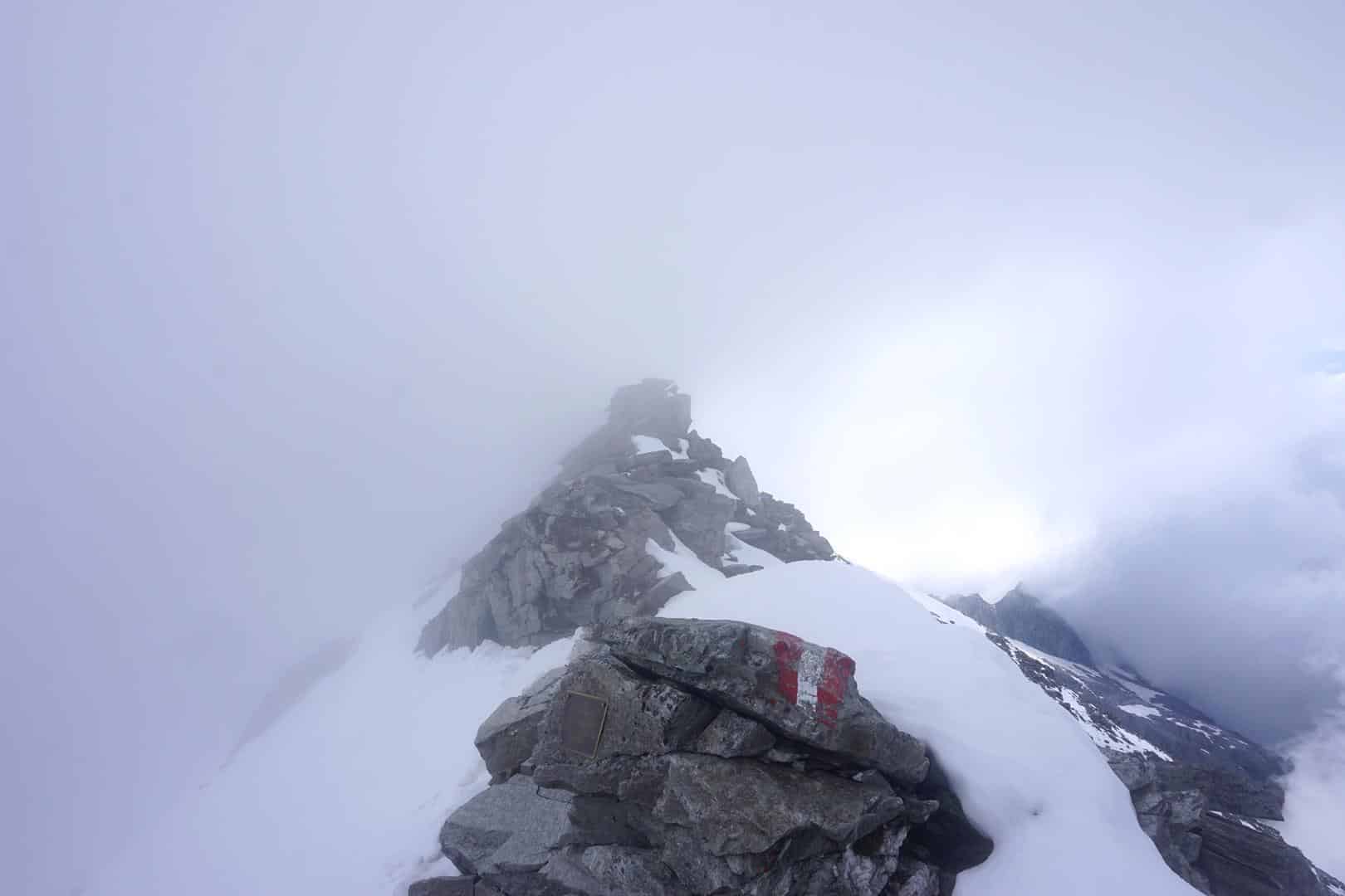 Zurück an der Scharte, folgen wir nun dem Senator-Beindorf-Weg Richtung Süden. Das macht trotz mäßiger Sicht wirklich viel Spaß. Nach einem kurzen Aufschwung, ist der Weg dann zunächst ohne große Höhenunterschiede zu meistern. Wir passieren die Kolmkarscharte (7) mit der markanten Kolmkarspitz, die heute aus dem Nebel ziemlich mystisch herausragt. Später wird es noch einmal kurz steiler und in Richtung Niedersachsenhaus gibt uns der Gratabschnitt schon mal einen Vorgeschmack auf den nächsten Tag. Trotz nun einiger Regentropfen ist das ein wirklich fantastischer Weg zum Niedersachsenhaus (8).