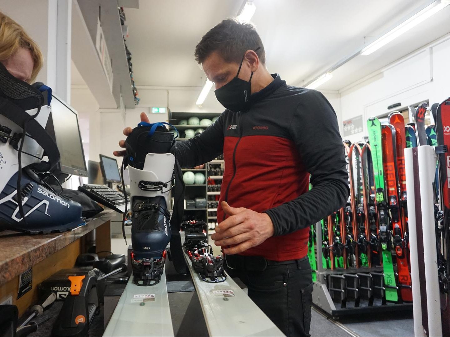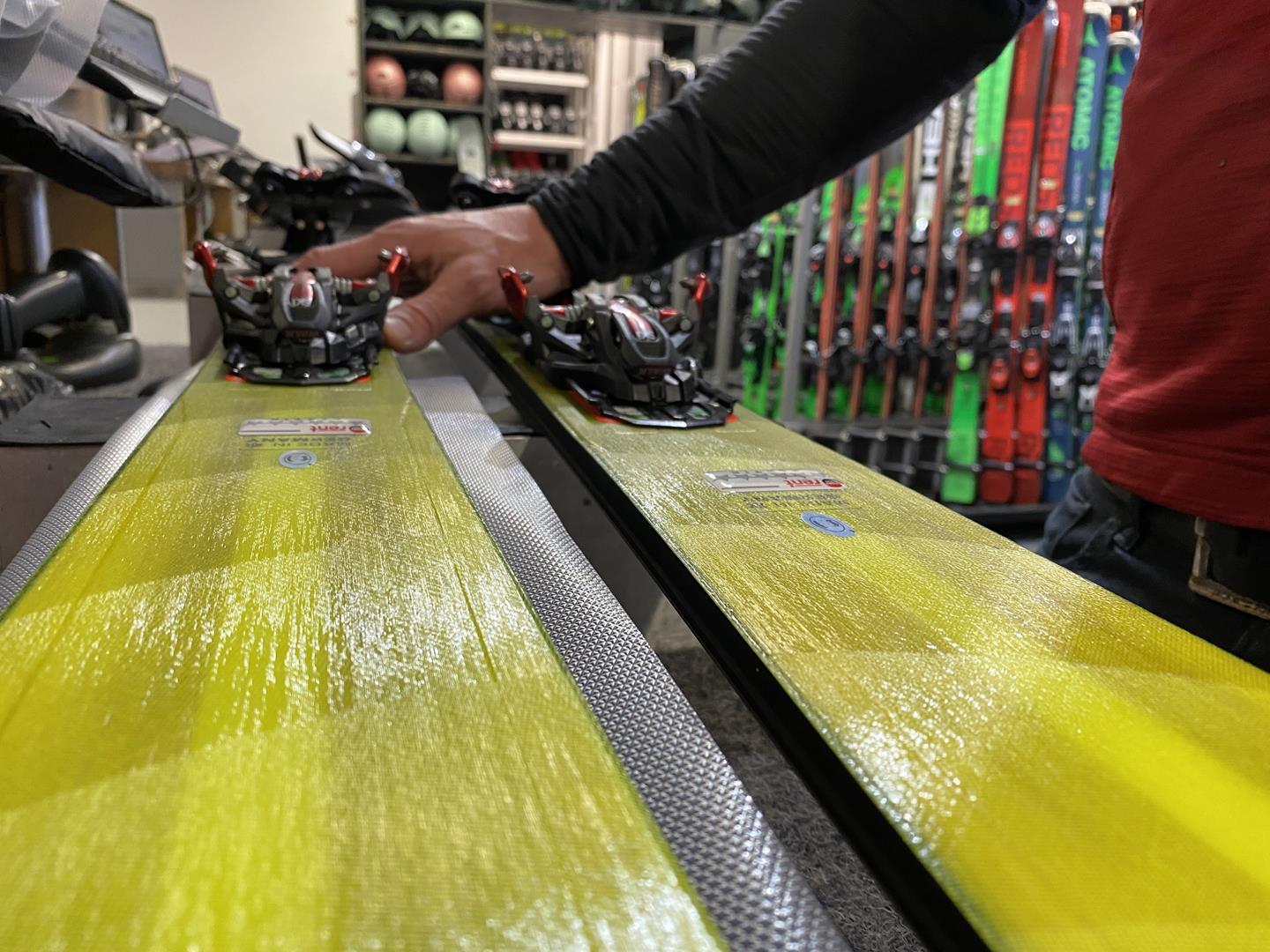 Doch dann verblasst mein Lächeln kurz und meine aufgewühlte Magengegend übernimmt die Oberhand, als uns Skifachmann Benni von Schulte Sports die Skitouren-Pinbindung erklärt. Zunächst muss der klobige Schuh, der an der Fußspitze zwei Löcher für die Aufnahme zweier Stifte aus der Bindung – sogenannte Pins – hat, vorne einrasten. „Schräg erst in das eine Loch, dann Druck auf die vordere Bindung“, meint Benni. Bei ihm sieht das ziemlich einfach aus, aber wenn ich es versuche, ist der Schuh nie in der Bindung.