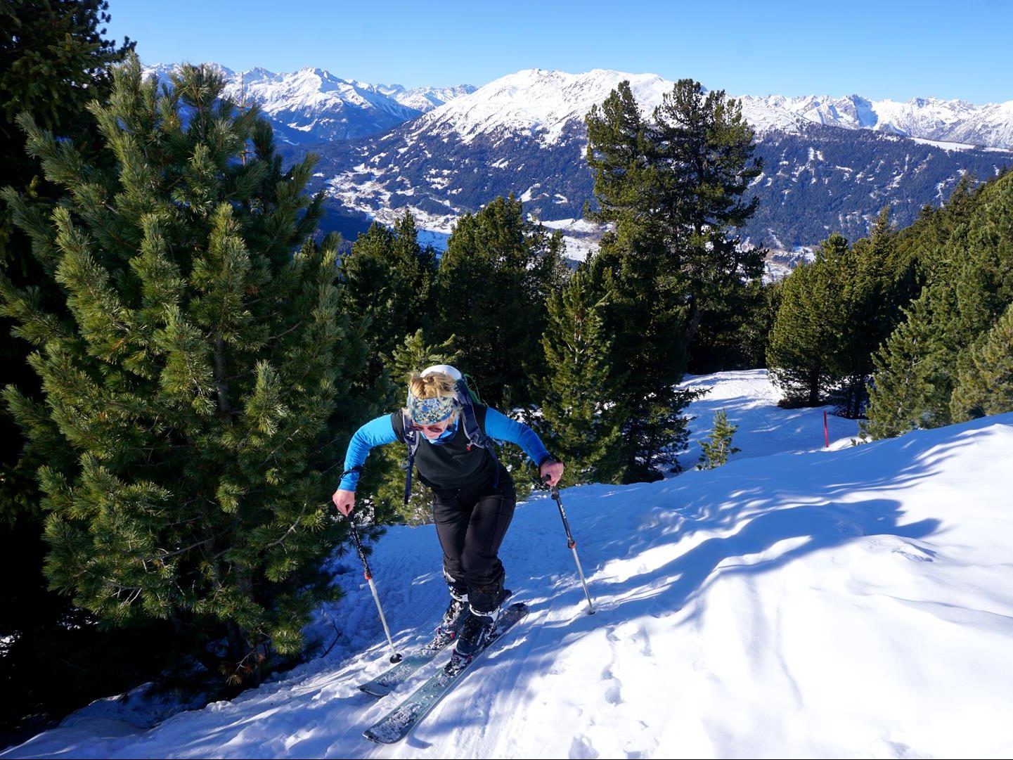 So kommen wir auch rasch in Schwung und steigen unsere ersten Höhenmeter auf Ski hinauf. Skibergsteigen. Ich. Wow. Wir zweigen in den Wald ab, entfernen uns rasch von der Piste und ringsherum ist alles ruhig und still. Die Orientierung auf der markierten Sechszeiger-Route fällt uns leicht, die Sonne erhitzt uns und wir genießen die Landschaft am Hochzeiger. Doch dann verwandelt sich die Aufstiegsspur in eine Eispiste, bei der uns sozusagen die Felle davonschwimmen und ich ein ums andere Mal ins Rutschen komme. Als mit Ski und Stöcken fuchtelndes Ungeheuer gehe ich ein halbes Dutzend Mal auf Bodenfühlung, oft sind die Ski weg. Yvette hingegen liefert sich lieber Duelle mit den Kiefern. Es ist lustig, aber auch sehr anstrengend wieder hochzukommen. Das kostet Kraft, aber am Ende des Tages beherrschen wir im Schlaf den Einstieg in die Bindung. Übung macht eben den Meister.