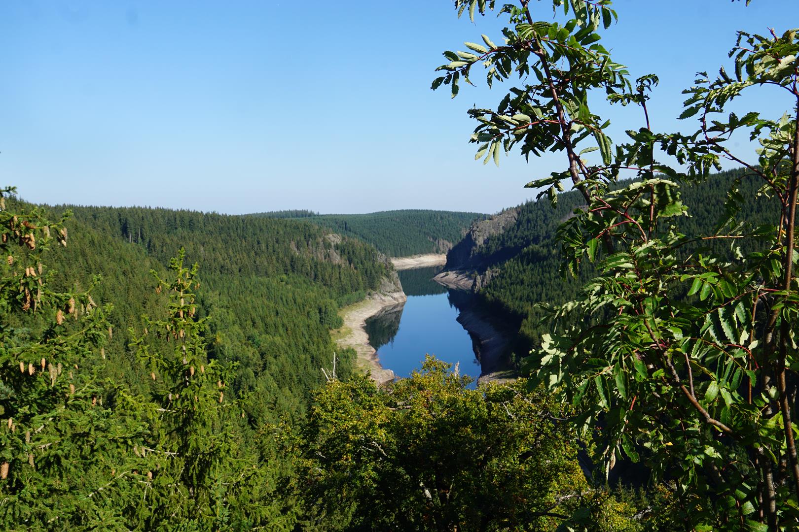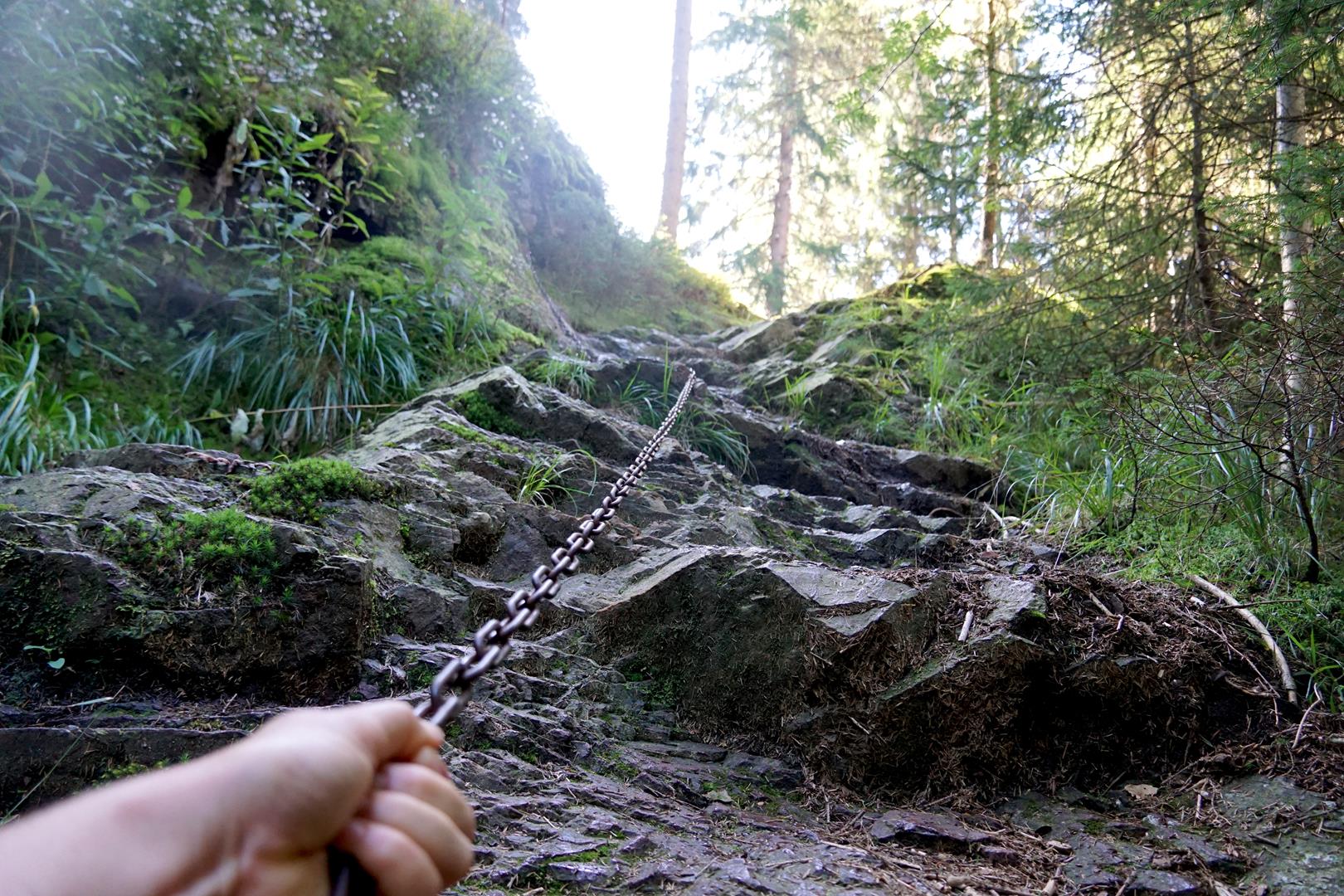 Diese Wanderung hat zwei verschiedene Facetten. Der erste Teil der Strecke ist wirklich traumhaft schön – beim zweiten lässt man am besten die vorangegangenen Eindrücke wirken und vergisst so den breiten asphaltierten Weg entlang der Schmalwassertalsperre. Viele schmale Pfade führen uns anfänglich durch den Wald, hier und da zeigt die Tour sogar einen Hauch von alpinem Charakter. Mit Ketten gesichert geht es hinauf zum Altenfels, der auf 650 Metern einen wahrlich perfekten Aussichtspunkt über die Schmalwassertalsperre und den Thüringer Wald bietet. Zwischendrin lockt der Wald immer wieder zum Steinpilzsammeln, zum Bewundern von Moos, Bächen und kleinen Wurzelpfaden. Noch mal richtig Fahrt nimmt die Wanderung in der Wolfs-Schlucht auf, ein wirklich lohnenswerter Wegabschnitt, der nochmals eher einem alpinen Steig gleicht, als einem Mittelgebirgswanderweg.